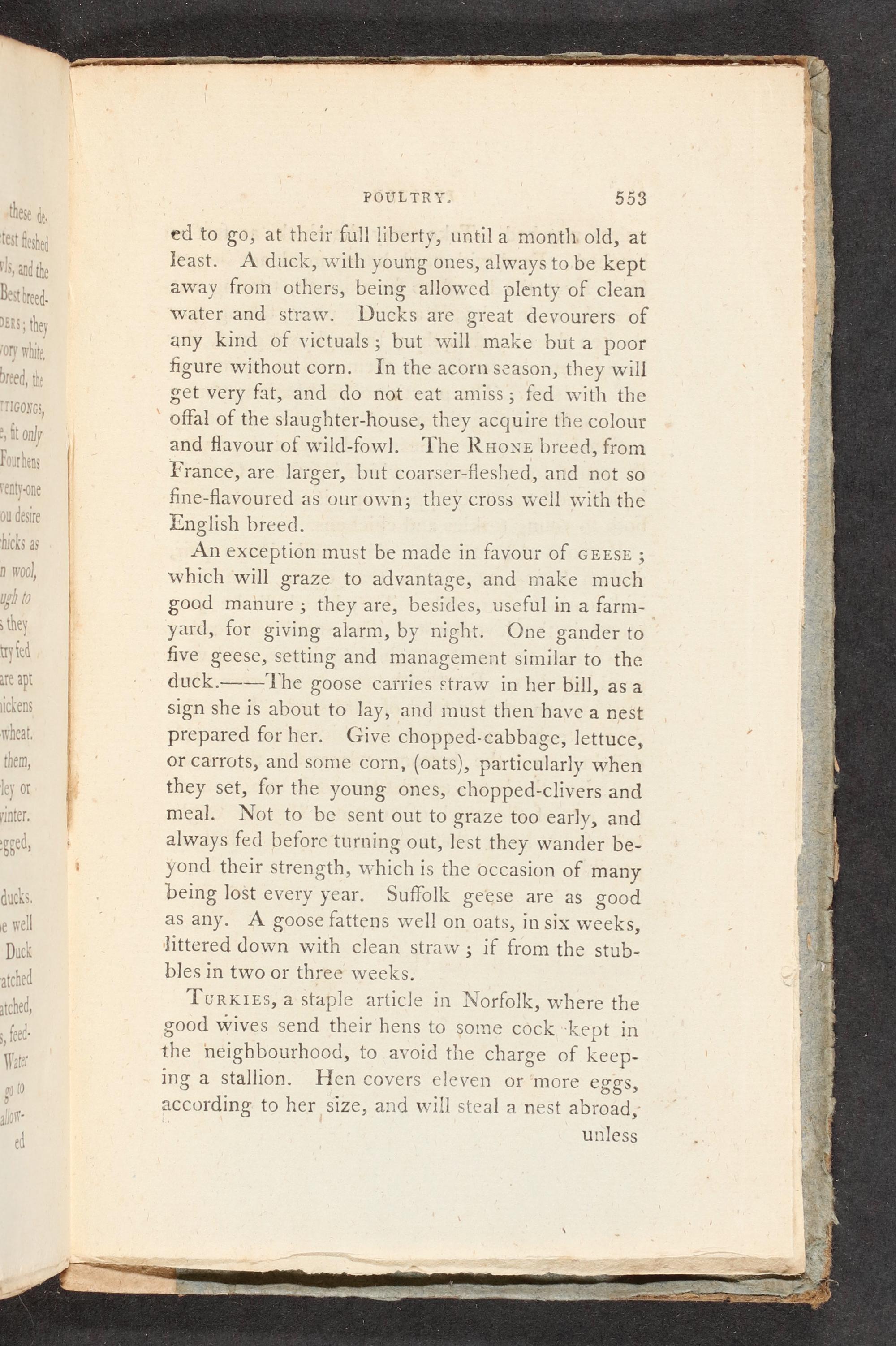 An exception must be made in favour of GEESE; which will graze to advantage, and make much good manure; they are, besides, useful in a farm-— yard, for giving alarm, by night. One gander to five geese, setting and management similar to the duck.——The goose carries straw in her bill, asa sign she is about to lay, and must then have a nest prepared for her. Give chopped-cabbage, lettuce, or carrots, and some corn,(oats), particularly when they set, for the young ones, chopped-clivers and meal. Not to be sent out to graze too early, and always fed before turning out, lest they wander be- yond their strength, which is the occasion of many being lost every year. Suffolk geese are as good as any. A goose fattens well on oats, in six weeks, hittered down with clean straw; if from the stub- bles in two or three weeks.