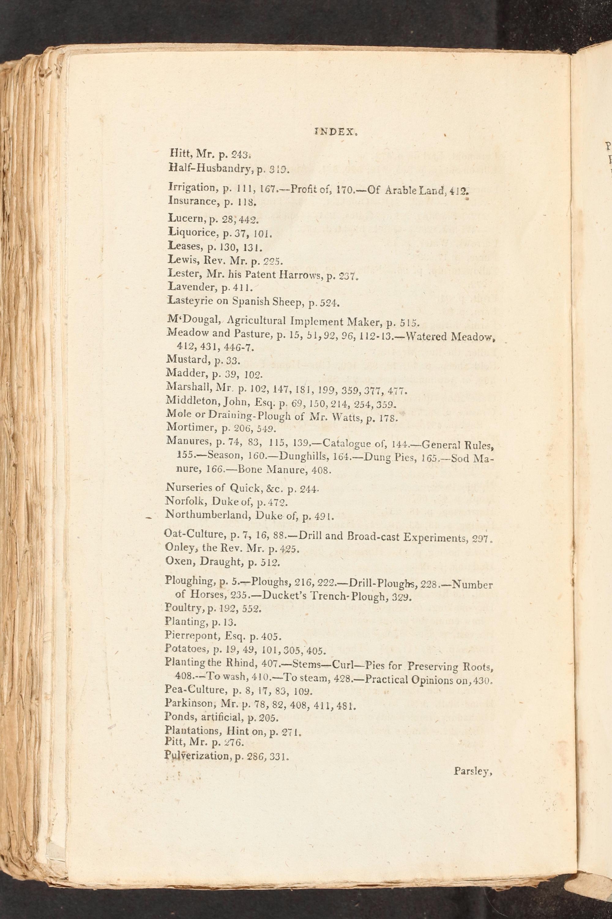Irrigation, p. 111, 167.—Profit of, 170.—Of Arable Land, 412. Insurance, p. 118,; Lucern, p. 28} 442.