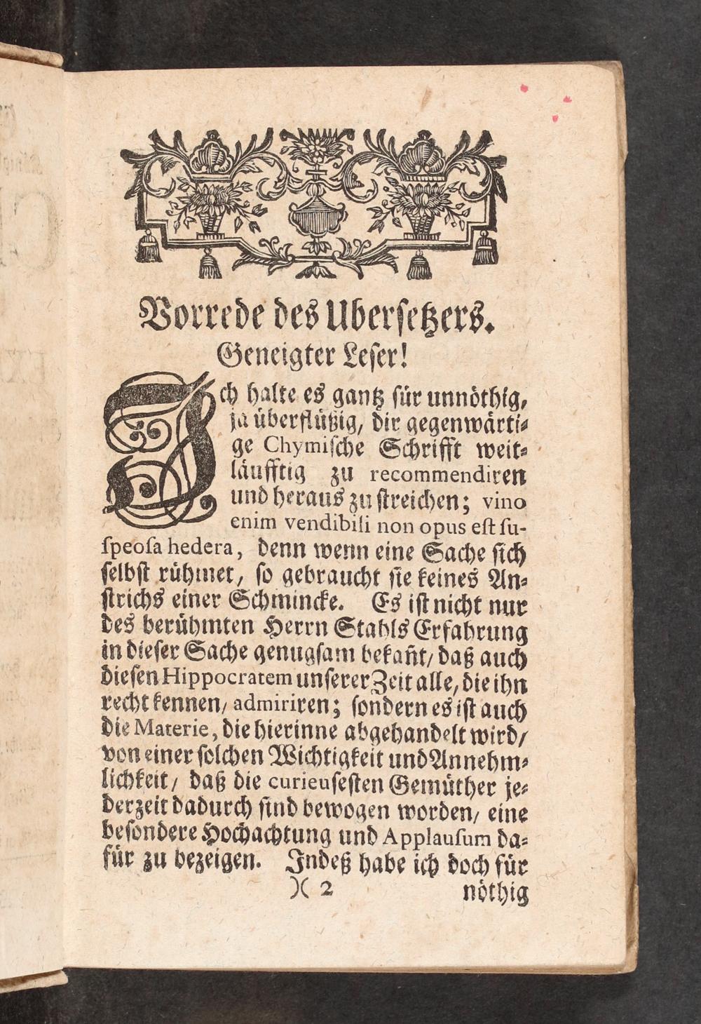 und heraus zu streichen; vino enim vendibili non opus est su- speosa hedera, denn wenn eine Sache sich selbst rühinet, so gebraucht sie keines An⸗ strichs einer Schmincke. Es ist nicht nur des berühmten Herrn Stahls Erfahrung in dieser Sache genugsam bekañt/ daß auch diesen Hippocratem unserer Zeit alle, die ihn recht kennen, admiriren; sondern es ist auch die Materie, die hierinne abgehandelt wird/ von einer solchen Wichtigkeit und Annehm⸗ lichkeit, daß die curieusesten Gemüther je⸗ derzeit dadurch sind bewogen worden, eine besöndere Hochachtung und Applausum da⸗ für zu bezeigen. Indeß habe ich doch für x2 nöthig