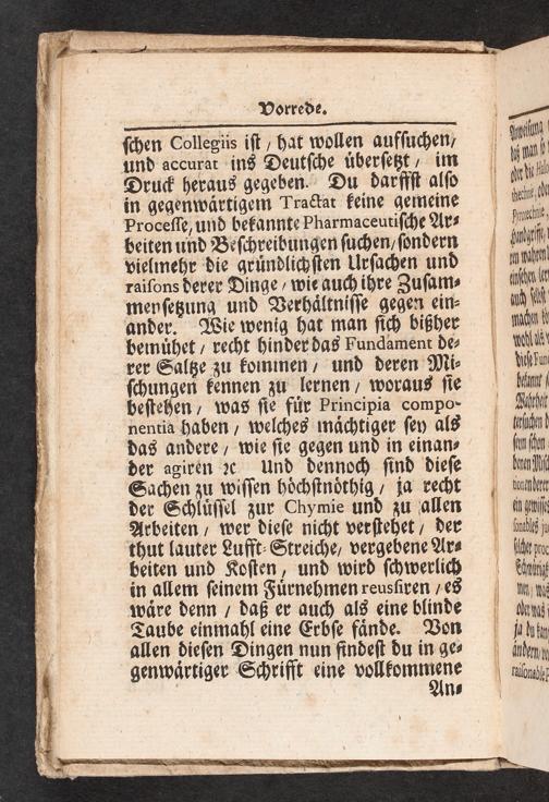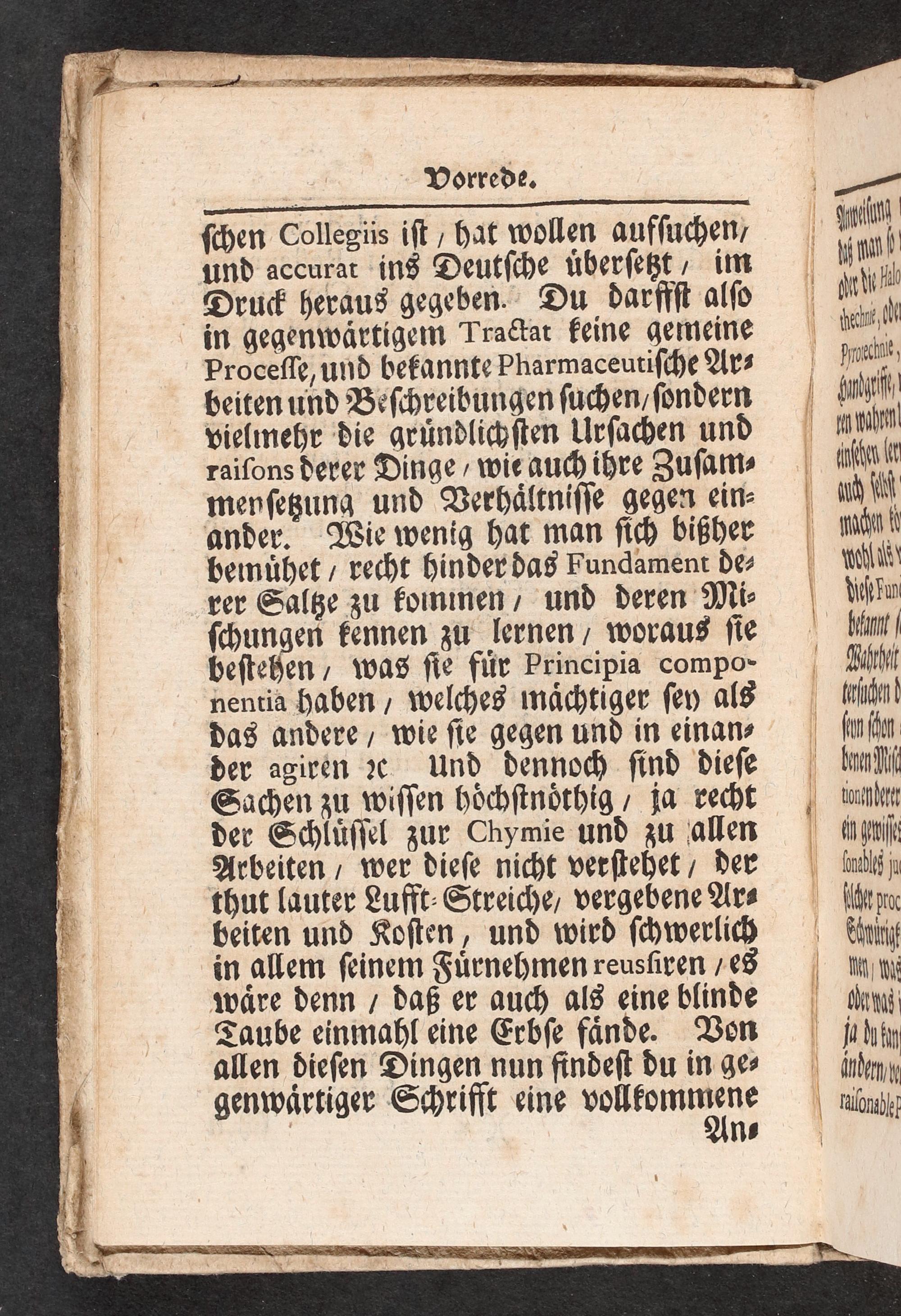 Druck heraus gegeben. Du darffst also uun in gegenwärtigem Tractat keine gemeine. Processe, und bekannte Pharmaceutische äus Dmeal beiten und Beschreibungen suchen/ sondern H vielmehr die gründlichsten Ursachen und n raisons derer Dinge/ wie auch ihre Zusam⸗ mensetzung und Verhältnisse gegen ein⸗ N ander. Wie wenig hat man sich bißher Rach