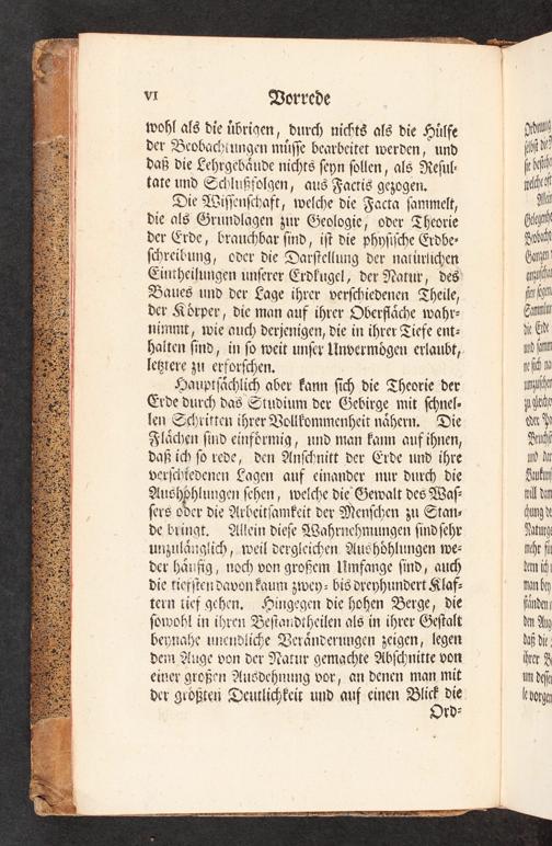 Hauptsächlich aber kann sich die Theorie der Erde durch das Studium der Gebirge mit schnel⸗ len Schritten ihrer Vollkommenheit nähern. Die Flächen sind einförmig, und man kann auf ihnen, daß ich so rede, den Anschnitt der Erde und ihre verschiedenen Lagen auf einander nur durch die Aushohlungen sehen, welche die Gewalt des Was⸗ sers oder die Arbeitsamkeit der Menschen zu Stan⸗ de bringt. Allein diese Wahrnehmungen sind sehr unzulänglich, weil dergleichen Aushöhlungen we⸗ der häufig, noch von großem Umfange sind, auch die riefsten davon kaum zwey⸗bis dreyhundert Klaf⸗ tern tief gehen. Hingegen die hohen Berge, die sowohl in ihren Bestandtheilen als in ihrer Gestalt beynahe unendliche Veränderungen zeigen, legen dem Auge von der Natur gemachte Abschnitte von einer großen Ausdehnung vor, an denen man mit der größten Deutlichkeit und auf einen—.—.