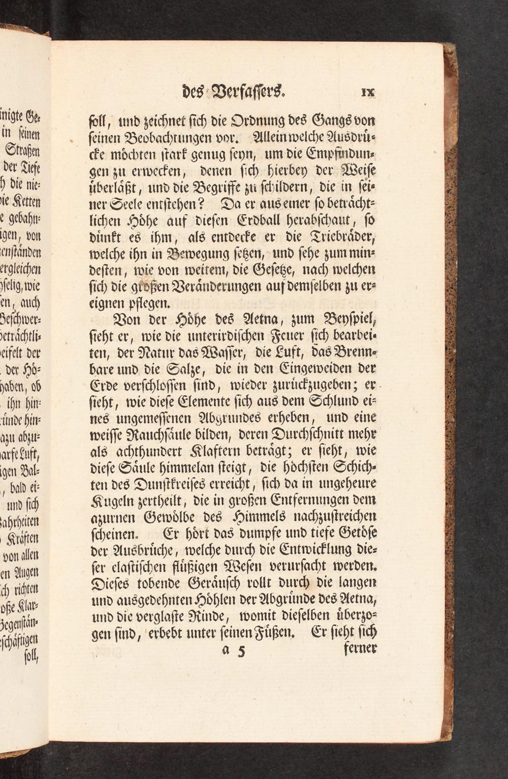 Von der Höhe des Aetna, zum Beyspiel, sieht er, wie die unterirdischen Feuer sich bearbei⸗ ten, der Natur das Wasser, die Luft, das Brenn⸗ bare und die Salze, die in den Eingeweiden der Erde verschlossen sind, wieder zurückzugeben; er sieht, wie diese Elemente sich aus dem Schlund ei⸗ nes ungemessenen Abgrundes erheben, und eine weisse Rauchsäule bilden, deren Durchschnitt mehr als achthundert Klaftern beträgt; er sieht, wie diese Säule himmelan steigt, die höchsten Schich⸗ ten des Dunstkreises erreicht, sich da in ungeheure