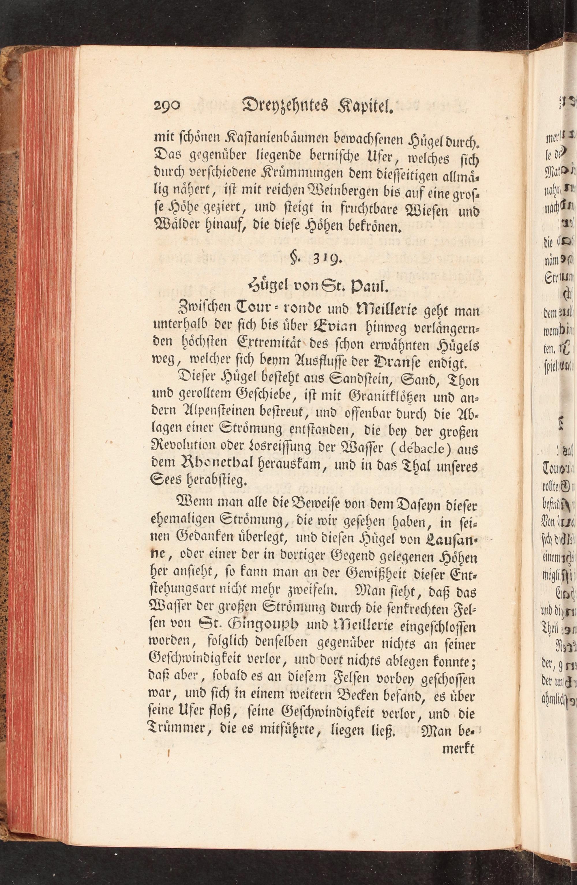 Wenn man alle die Beweise von dem Daseyn dieser ehemaligen Strömung, die wir gesehen haben, in sei⸗ nen Gedanken überlegt, und diesen Hügel von Lausan⸗; ne, oder einer der in dortiger Gegend gelegenen Höhen her ansieht, so kann man an der Gewißheit dieser Ent⸗ stehungsart nicht mehr zweifeln. Man sieht, daß das Wasser der großen Strömung durch die senkrechten Fel⸗ sen von St. Gingouph und Meillerie eingeschlossen worden, folglich denselben gegenüber nichts an seiner Geschwindigkeit verlor, und dort nichts ablegen konnte; daß aber, sobald es an diesem Felsen vorbey geschossen war, und sich in einem weitern Becken befand, es über seine Ufer floß, seine Geschwindigkeit verlor, und die