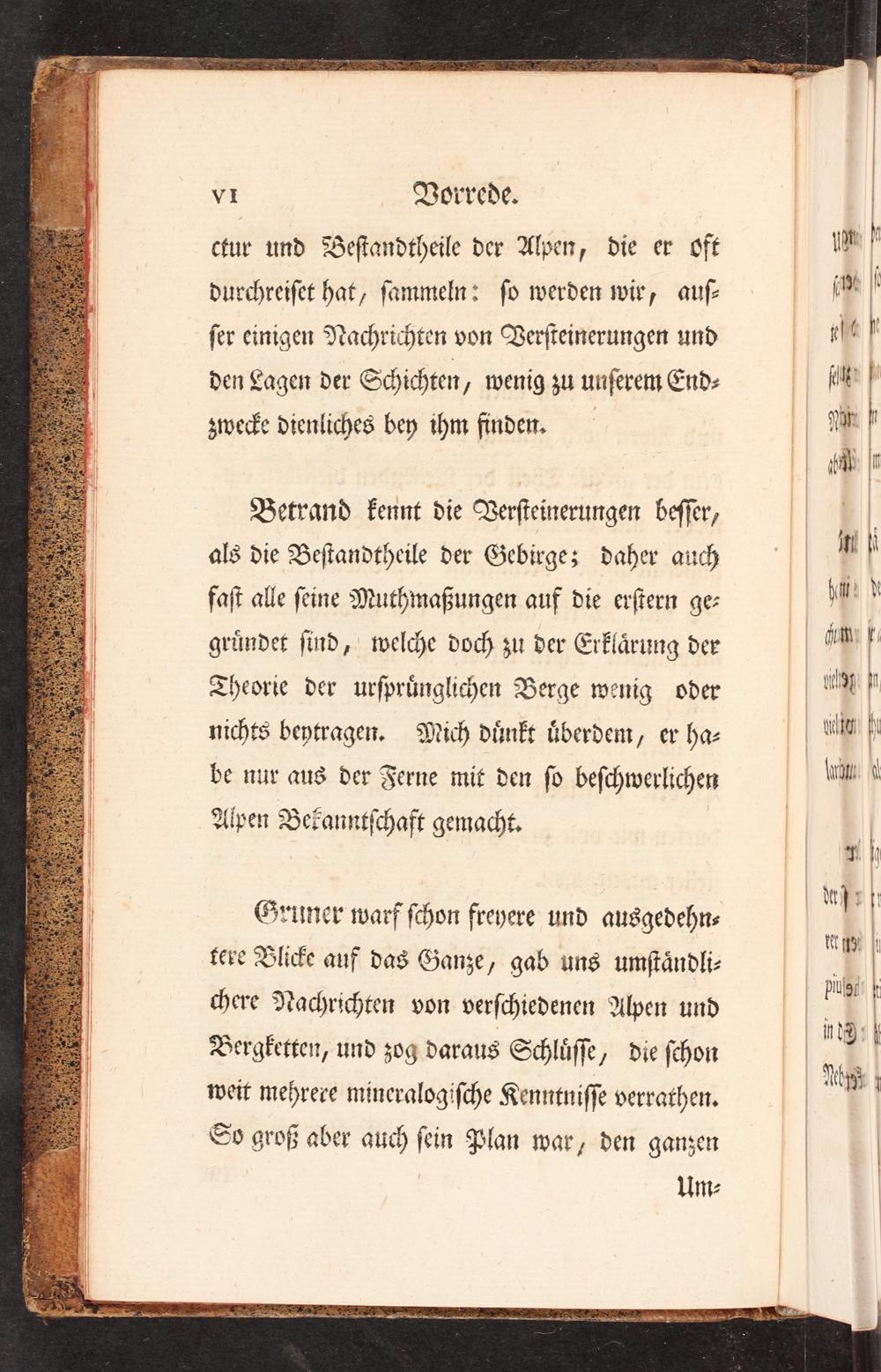 ctur und Bestandtheile der Alpen, die er oft durchreiset hat, sammeln: so werden wir, aus⸗ ser einigen Nachrichten von Versteinerungen und den Lagen der Schichten wenig zu unserem End⸗ zwecke dienliches bey ihm finden.