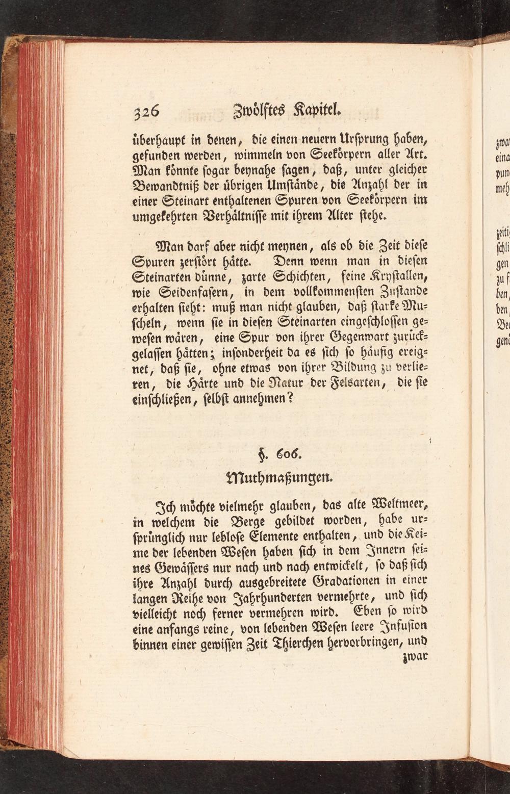 Ich möchte vielmehr glauben, das alte Weltmeer, in welchem die Berge gebildet worden, habe ur⸗ sprünglich nur leblose Elemente enthalten, und die Kei⸗ me der lebenden Wesen haben sich in dem Innern sei⸗ nes Gewässers nur nach und nach entwickelt, so daß sich ihre Anzahl durch ausgebreitete Gradationen in einer langen Reihe von Jahrhunderten vermehrte, und sich vielleicht noch ferner vermehren wird. Eben so wird eine anfangs reine, von lebenden Wesen leere Infusion