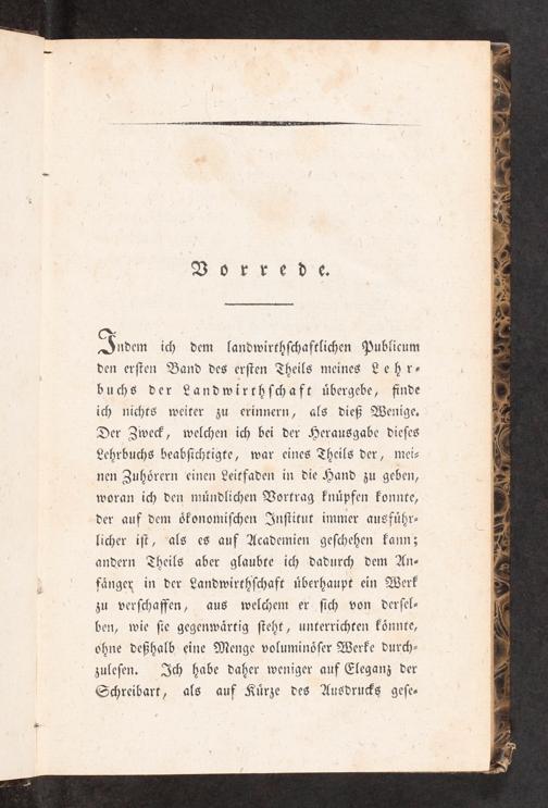 Iden ich dem landwirthschaftlichen Publicum den ersten Band des ersten Theils meines Leher— buchs der Landwirthschaft übergebe, finde ich nichts weiter zu erinnern, als dieß Wenige. Der Zweck, welchen ich bei der Herausgabe dieses Lehrbuchs beabsichtigte, war eines Theils der, mei— nen Zuhörern einen Leitfaden in die Hand zu geben, woran ich den mündlichen Vortrag knüpfen konnte, der auf dem ökonomischen Institut immer ausführ— licher ist, als es auf Academien geschehen kann; andern Theils aber glaubte ich dadurch dem An— fänger in der Landwirthschaft überhaupt ein Werk zu verschaffen, aus welchem er sich von dersel— ben, wie ste gegenwärtig steht, unterrichten könnte, ohne deßhalb eine Menge voluminöser Werke durch— zulesen. Ich habe daher weniger auf Eleganz der Schreibart, als auf Kürze des Ausdrucks gese—