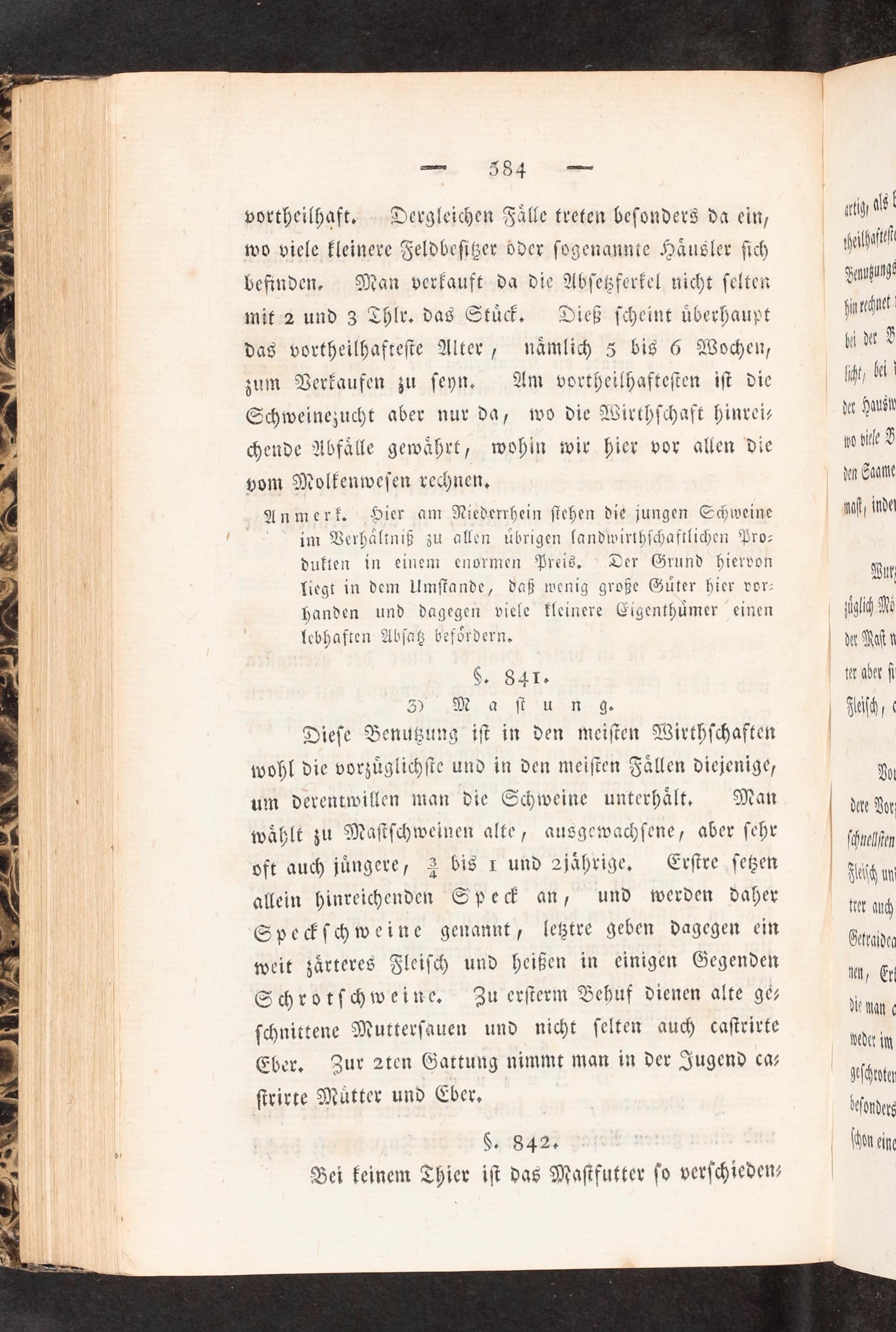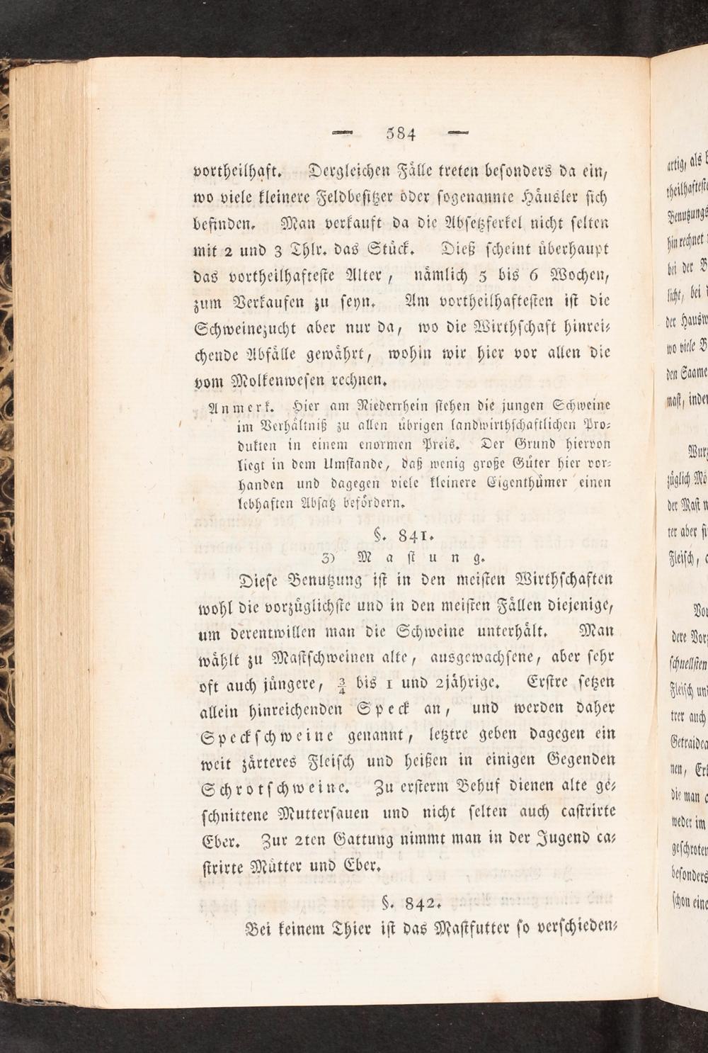 vortheilhaft. Dergleichen Fälle treten besonders da ein, wo viele kleinere Feldbesitzer oder sogenannte Häusler sich befinden. Man verkauft da die Absetzferkel nicht selten mit 2 und 3 Thlr. das Stück. Dieß scheint überhaupt das vortheilhafteste Alter, nämlich 5 bis 6 Wochen, zum Verkaufen zu seyn. Am vortheilhaftesten ist die Schweinezucht aber nur da, wo die Wirthschaft hinrei— chende Abfälle gewährt, wohin wir hier vor allen die vom Molkenwesen rechnen.