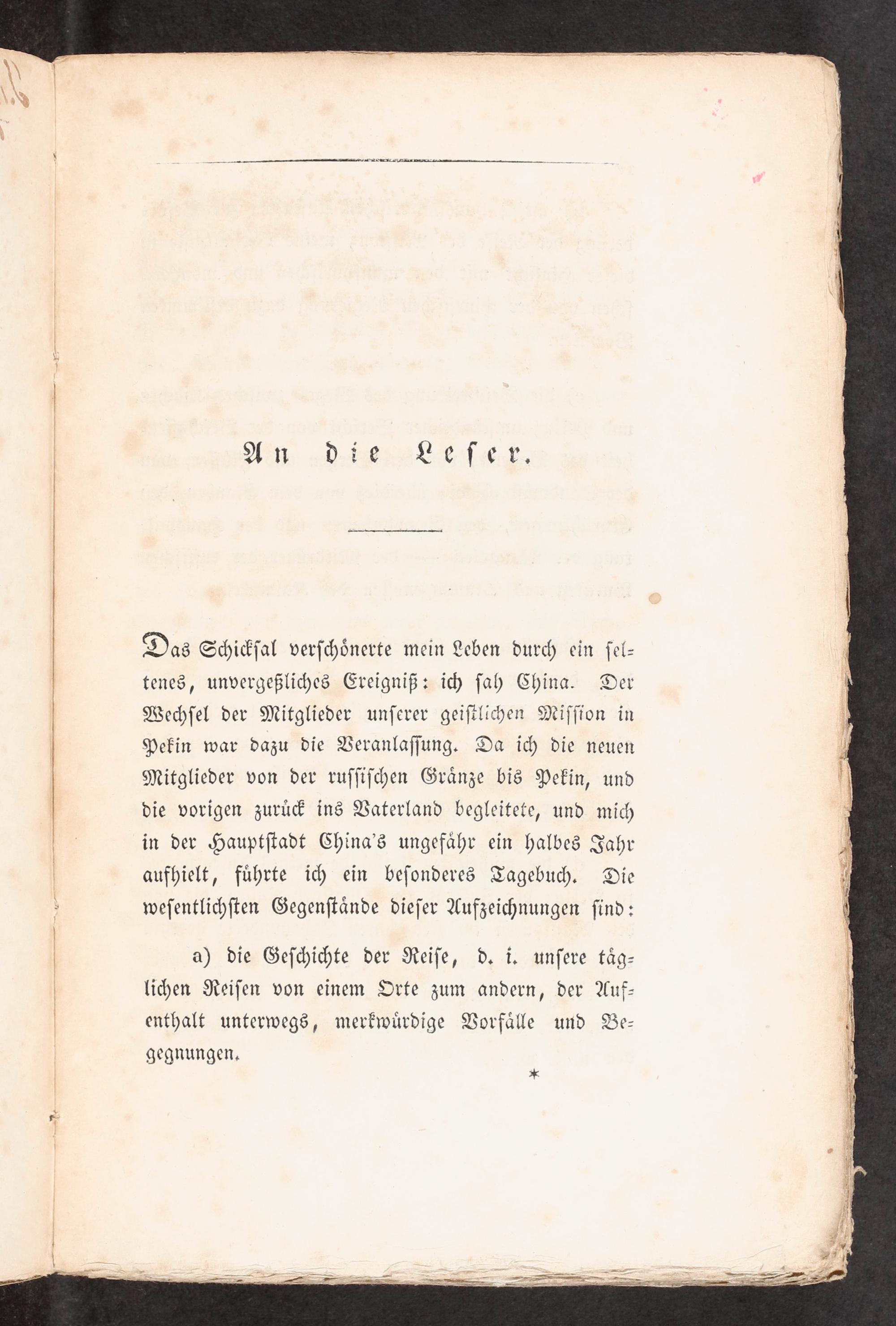 Das Schicksal verschönerte mein Leben durch ein sel— tenes, unvergeßliches Ereigniß: ich sah China. Der Wechsel der Mitglieder unserer geistlichen Mission in Pekin war dazu die Veranlassung. Da ich die neuen Mitglieder von der russischen Gränze bis Pekin, und die vorigen zurück ins Vaterland begleitete, und mich in der Hauptstadt China's ungefähr ein halbes Jahr aufhielt, führte ich ein besonderes Tagebuch. Die wesentlichsten Gegenstände dieser Aufzeichnungen sind: