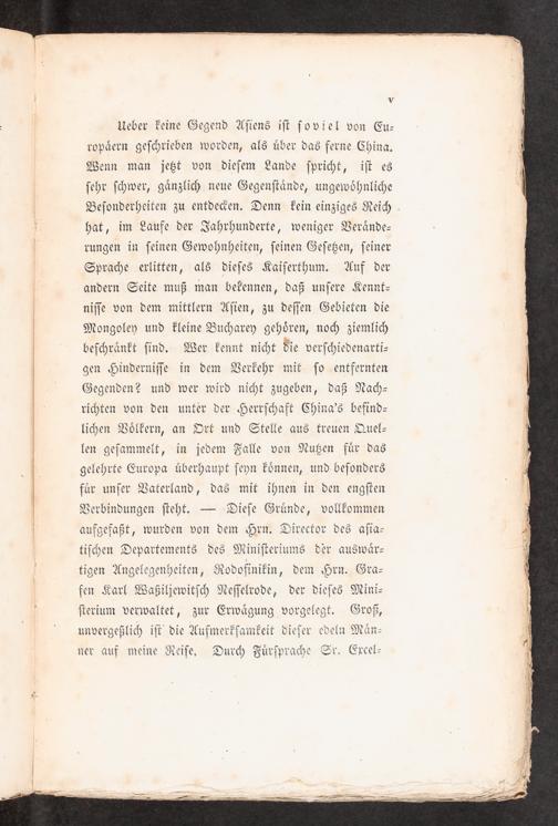 hat, im Laufe der Jahrhunderte, weniger Verände— rungen in seinen Gewohnheiten, seinen Gesetzen, seiner Sprache erlitten, als dieses Kaiserthum. Auf der andern Seite muß man bekennen, daß unsere Kennt— nisse von dem mittlern Asien, zu dessen Gebieten die Mongoley und kleine Bucharey gehören, noch ziemlich beschränkt sind. Wer kennt nicht die verschiedenarti— gen Hindernisse in dem Verkehr mit so entfernten Gegenden? und wer wird nicht zugeben, daß Nach— richten von den unter der Herrschaft China's befind— lichen Völkern, an Ort und Stelle aus treuen Quel— len gesammelt, in jedem Falle von Nutzen für das gelehrte Europa überhaupt seyn können, und besonders für unser Vaterland, das mit ihnen in den engsten Verbindungen steht.— Diese Gründe, vollkommen aufgefaßt, wurden von dem Hrn. Director des asia— tischen Departements des Ministeriums der auswär— tigen Angelegenheiten, Rodofinikin, dem Hrn. Gra⸗ fen Karl Waßiljewitsch Nesselrode, der dieses Mini— sterium verwaltet, zur Erwägung vorgelegt. Groß, unvergeßlich ist die Aufmerksamkeit dieser edeln Män—