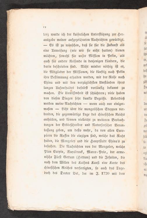 lenz wurde ich der kaiserlichen Unterstützung zur Her— ausgabe meiner aufgezeichneten Nachrichten gewürdigt. — Es ist zu wünschen, daß sie für die Zukunft als eine Anweisung(wie wir sie nicht hatten) dienen möchten, sowohl für unsre Mission in Pekin, als auch für andere Reisende in denjenigen Ländern, die darin beschrieben sind. Nicht minder nöthig ist es, die Mitglieder der Missionen, die künftig nach Pekin ihre Bestimmung erhalten werden, mit der Reise nach China und mit den vorzüglichsten Umständen ihres langen Aufenthaltes daselbst vorläufig bekannt zu machen. Die Unwissenheit ist schüchtern; viele haben von diesen Dingen sehr dunkle Begriffe. Ueberdieß werden meine Nachrichten— wenn auch nur einiger— maßen— Licht über die mongolischen Steppen ver— breiten, die gegenwärtige Lage des chinesischen Reichs enthüllen, und können vielleicht zu weiteren Beobach— tungen der Erdbeschreiber und Naturforscher Veran— lassung geben, um desto mehr, da von allen Euro— päern die Russen die einzigen sind, welche das Recht haben, die Mongoley und die Hauptstadt China's zu besuchen. Die Nachrichten von der Mongoley, welche Plan Carpin, Ruysbroek, Marco-Polo, der arme— nische Fürst Gettum(Hettum) und die Jesuiten, die nach dem Willen des Kaisers Kansi eine Karte des chinesischen Reiches verfertigten, so auch das Tage— buch des Doctor Bel, der im J. 1720 mit dem