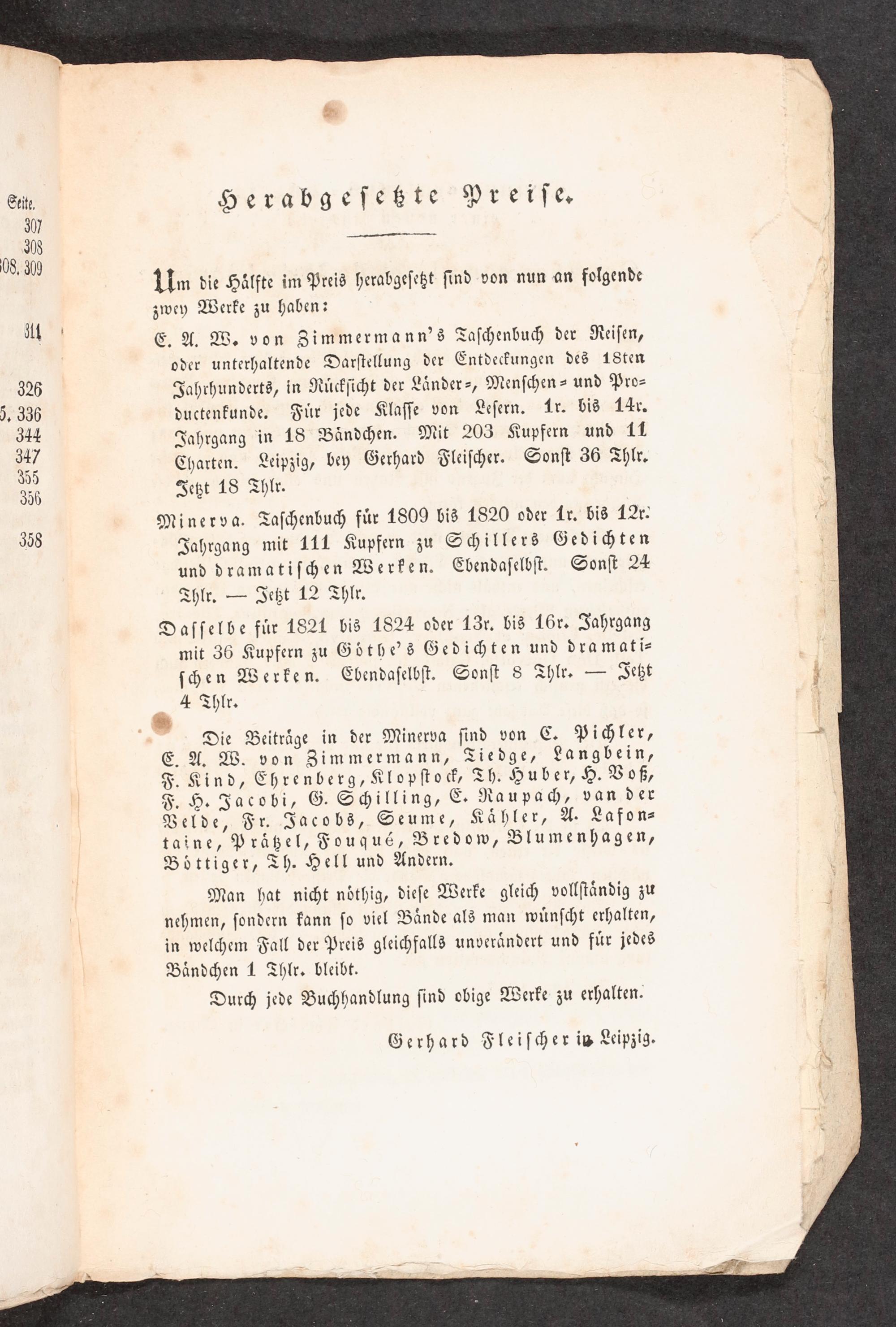 E. A. W. von Zimmermann's Taschenbuch der Reisen, oder unterhaltende Darstellung der Entdeckungen des 18ten Jahrhunderts, in Rücksicht der Länder—, Menschen- und Pro- ductenkunde. Für jede Klasse von Lesern. Lr. bis 14r. Jahrgang in 18 Bändchen. Mit 203 Kupfern und 11 Charten. Leipzig, bey Gerhard Fleischer. Sonst 36 Thlr. Jetzt 18 Thlr.
