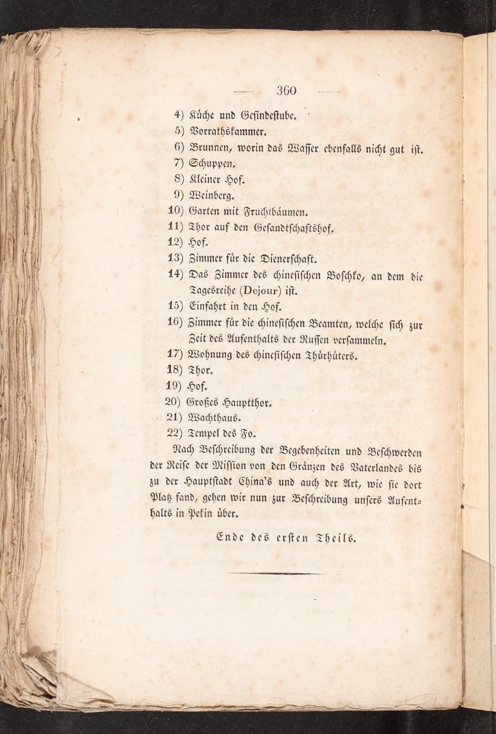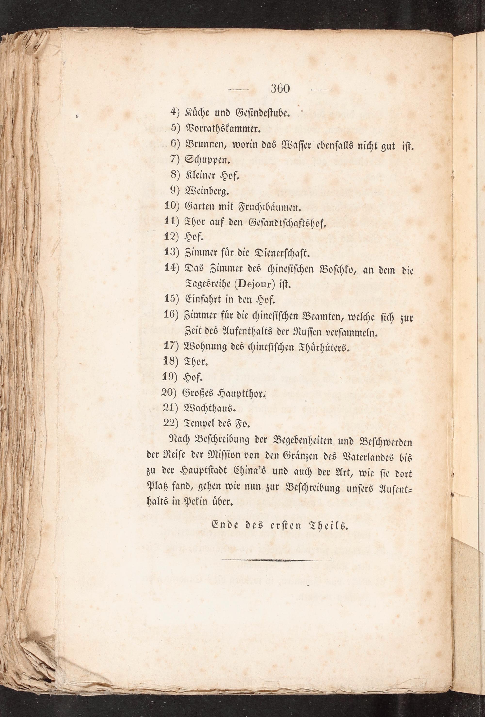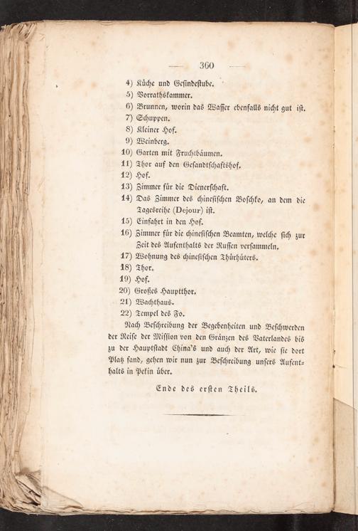 l 4) Küche und Gesindestube. 5) Vorrathskammer. 6) Brunnen, worin das Wasser ebenfalls nicht gut ist. 7) Schuppen. 8) Kleiner Hof. 9) Weinberg. 10) Garten mit Fruchtbäumen. 11) Thor auf den Gesandtschaftshof. 12) Hof. 13) Zimmer für die Dienerschaft. 14) Das Zimmer des chinesischen Boschko, an dem die f Tagesreihe(Dejour) ist. 19 15) Einfahrt in den Hof. 16) Simmer für die chinesischen Beamten, welche sich zur Zeit des Aufenthalts der Russen versammeln. 17) Wohnung des chinesischen Thürhüters. l 18) Thor. „ 19) Hof. 20) Großes Hauptthor. 5 5 21) Wachthaus. 22) Tempel des Fo. Nach Beschreibung der Begebenheiten und Beschwerden der Reise der Mission von den Gränzen des Vaterlandes bis N zu der Hauptstadt China's und auch der Art, wie sie dort ö Platz fand, gehen wir nun zur Beschreibung unsers Aufent— 1 halts in Pekin über. 1