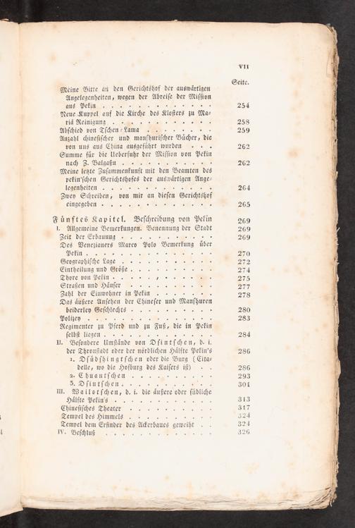 vII 10 8 Seite 1 Meine Bitte an den Gerichtshof der auswärtigen F Angelegenheiten, wegen der Abreise der Mission 2 nutzt Pekin 5 254 eue Kuppel auf die Kirche des Klosters zu Ma⸗ 9 kick Reinigung. 258 0 Abschied von Tschen-Laenna a 259 1 Anzahl chinesischer und manshurischer Bücher, die 05 von uns aus China ausgeführt wurden. 262 9 Summe für die Ueberfuhr der Mission von Pekin N nach Z. Balg; 3 262 Meine letzte Zusammenkunft mit den Beamten des pekin'schen ent e der ee Ange⸗ legen heiten. 5 264 Zwey Schreiben, von mir an bien Gerichts 0 Eingegebemnss 265 Fünftes Kapitel. Beschreibung von Pekin 269 1. Allgemeine Bemerkungen. Benennung der Stadt 269 Zeiß der Erbauung 3 269 Des Venezianers Marco Polo Bemerkung über i 270 Geographische Lage 8 292 Eintheilung und Grö ße 274 Thore von Pekin 275 Straßen und Häus ere 277 Zahl der Einwohner in Pekin 278 Das äußere Ansehen der Chineser und Manshuren beider sey schl ech: 280 Polize y ö„„ 283 Regimenter zu Pferd und zu Fuß, die in Pekin selbst liegen... 5 3 284 II. Besondere Umstände von Osi ntfchen, 2 5 5 Thronstadt oder der nördlichen Hälfte Pekin's 286 Dsüdshingtschen oder die Burg(Cita— delle, wo die Hofburg des N ist) 286 ö Shiaguschen 3 293 5. Dsintschen.„ 301 III. Wailotschen, d. i. die äußere oder südliche Hälfte Peeg ss 313 Chinesisches Theater. 317 Tempel des Himmels 5. 324 1 dem Erfinder des Ackerbaues geweiht 324 Beschlußß 326