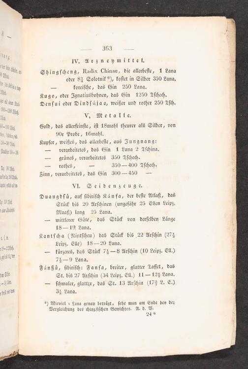 Shingscheng, Radix Chinae, die allerbeste, 1 Lana oder 84 Solotnik“), kostet in Silber 350 Lana. — koreische, das Gin 250 Lana. Kugo, oder Ignatiusbohnen, das Gin 1250 Tschech. Densui oder Dindsäüja so, weißer und rother 250 Tsch.