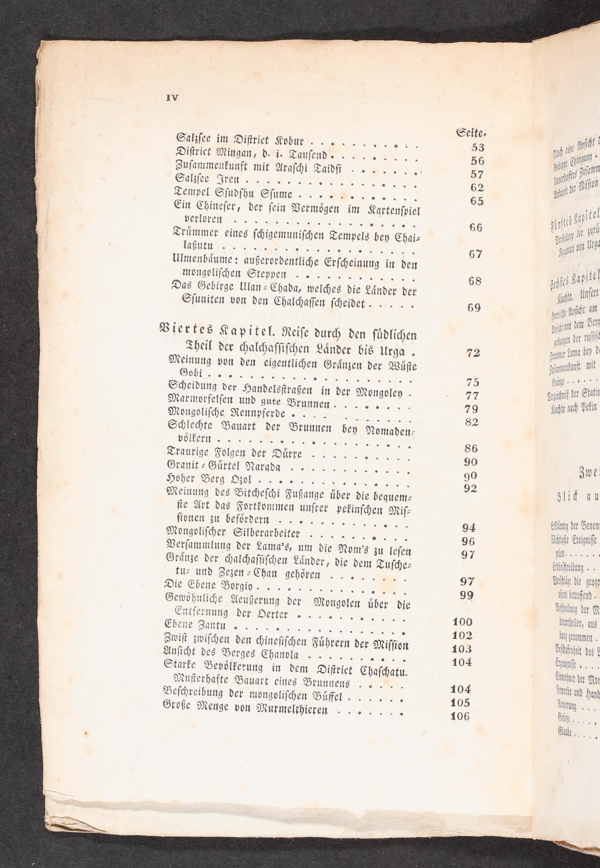 Viertes Kapitel. Reise durch den südlichen Theil der chalchassischen Länder bis Urga. Meinung von den eigentlichen Gränzen der Wüste FFF„3 Scheidung der Handelsstraßen in der Mongoley. Marmorfelsen und gute Brunnen. Mongolische Rennpferde. Schlechte Bauart der Brunnen bey Nomaden—⸗ JJ 2 Traurige Folgen der Dürree.... Granit-Gürtel Narada... 53 % //(V0 Meinung des Bitcheschi Fußange über die bequem— ste Art das Fortkommen unsrer pekinschen Mis⸗ sienen zu befö rden 8 Mongolischer Silberar beiter.... 5 Versammlung der Lama's, um die Nom's zu lesen Gränze der chalchassischen Lander, die dem Tusche⸗ tu⸗ und Zezen-Chan gehören. 8 Die Ebene Borgio. 222%„ Gewöhnliche Aeußerung der Mongolen über die
