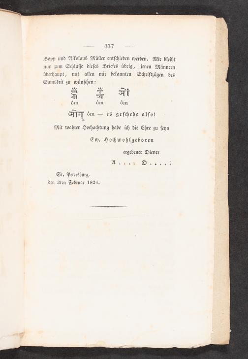 Bopp und Nikolaus Müller entschieden werden. Mir bleibt nur zum Schlusse dieses Briefes übrig, jenen Männern überhaupt, mit allen mir bekannten Schriftzügen des Samskrit zu wünschen: