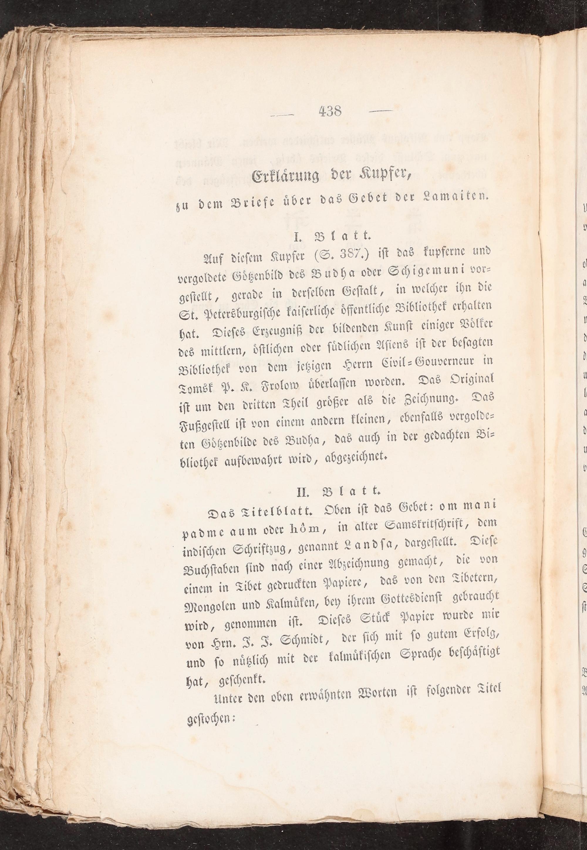 Das Titelblatt. Oben ist das Gebet: om mani padme aum oder hôm, in alter Samsrritschrift, dem indischen Schriftzug, genannt Landsa, dargestellt. Diese Buchstaben sind nach einer Abzeichnung gemacht, die von einem in Tibet gedruckten Papiere, das von den Tibetern, lmüken, bey ihrem Gottesdienst gebraucht ist Dieses Stück Papier wurde mir der sich mit so gutem Erfolg, zükischen Sprache beschäftigt