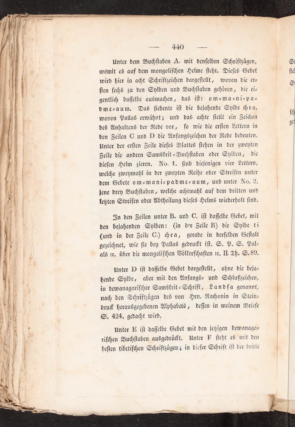 Unter D ist dasselbe Gebet dargestellt, ohne die beja— hende Sylbe, aber mit den Anfangs- und Schlußzeichen, in dewanagarischer Samskrit-Schrift, Landsa genannt, nach den Schriftzügen des von Hrn. Rachonin in Stein— druck herausgegebenen Alphabets, dessen in meinem Briefe S. 424. gedacht wird.