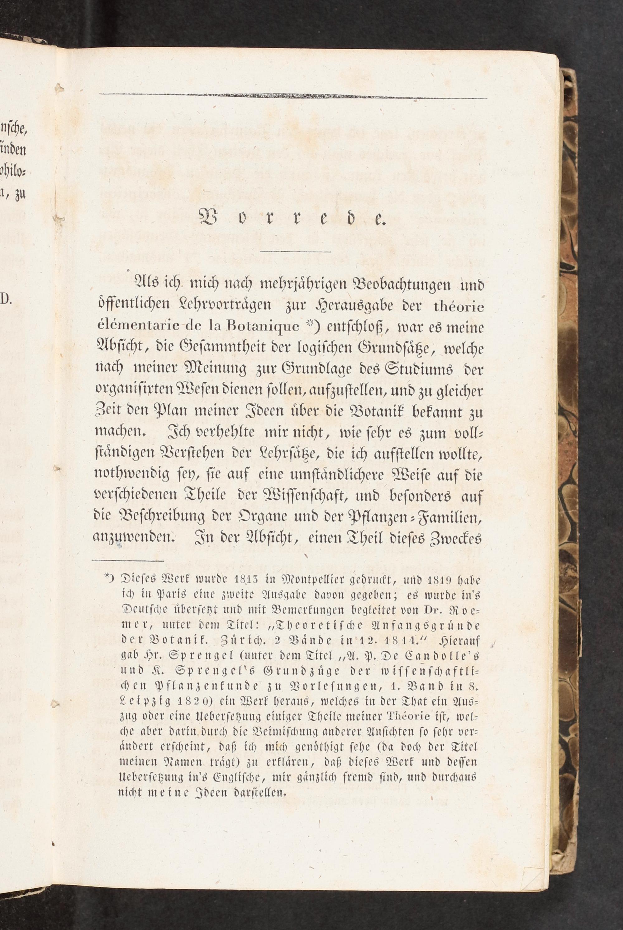 Als ich mich nach mehrjährigen Beobachtungen und offentlichen Lehrvorträgen zur Herausgabe der théorie élementarie de la Botanique') entschloß, war es meine Absicht, die Gesammtheit der logischen Grundsätze, welche nach meiner Meinung zur Grundlage des Studiums der organisirten Wesen dienen sollen, aufzustellen, und zu gleicher Zeit den Plan meiner Ideen über die Botanik bekannt zu machen. Ich verhehlte mir nicht, wie sehr es zum voll— ständigen Verstehen der Lehrsätze, die ich aufstellen wollte, nothwendig sey, sie auf eine umständlichere Weise auf die verschiedenen Theile der Wissenschaft, und besonders auf die Beschreibung der Organe und der Pflanzen-Familien, anzuwenden. In der Absicht, einen Theil dieses Zweckes