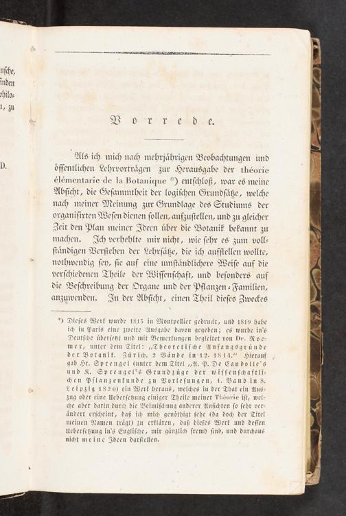 ) Dieses Werk wurde 1818 in Montpellier gedruckt, und 1819 habe ich in Paris eine zweite Ausgabe davon gegeben; es wurde in's Deutsche überseßt und mit Bemerkungen begleitet von Dr. Roe— mer, unter dem Titel:„Theoretische Anfangsgründe der Botanik. Zürich. 2 VBände in 12. 1814.“ Hierauf gab Hr. Sprengel(unter dem Titel„A. P. De Can dolle's und K. Sprengel's Grundzüge der wissenschaftli— chen Pflanzenkunde zu Vorlesungen, 1. Band in 8. Leipzig 1820) ein Werk heraus, welches in der That ein Aus— zug oder eine Uebersetzung einiger Theile meiner Théorie ist, wel— che aber darin durch die Beimischung anderer Ansichten so sehr ver— ändert erscheint, daß ich mich genöthigt sehe(da doch der Titel meinen Namen trägt) zu erklären, daß dieses Werk und dessen Uebersetzung in's Englische, mir gänzlich fremd sind, und durchaus nicht meine Ideen darstellen.