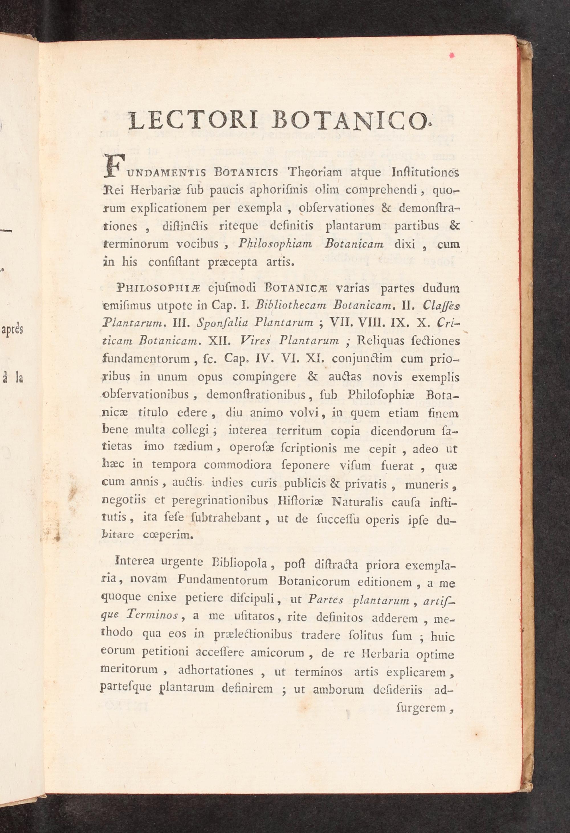 Interea urgente Pibliopola, post distracta priora exempla- ria, novam Fundamentorum Botanicorum editionem„ à me quoque enixe petiere discipuli, ut Partes plantarum, artis- que Jerminos, à me usitatos, rite definitos adderem„ me- thodo qua eos in prælectionibus tradere solitus sum; huic eorum petitioni accessere amicorum, de re Herbaria optime meritorum, adhortationes„ ut terminos artis explicarem, partesque plantarum definirem; ut amborum desideriis ad-