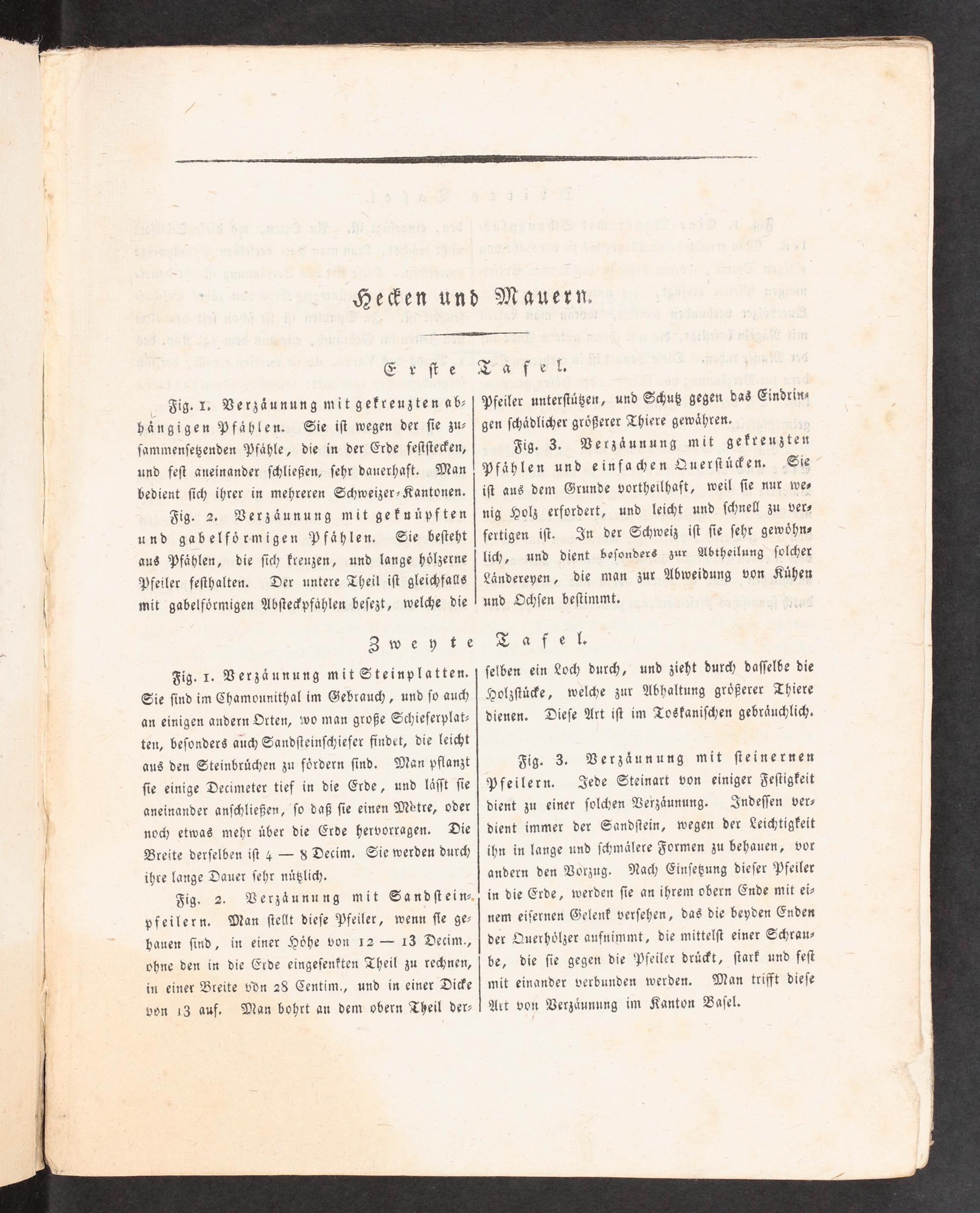 Verzäunung mit ſieinernen Pfeilern. Jede Steinart von einiger Feſtigkeit dient zu einer ſolchen Verzäunung«. Indeſſen ver- dient immer der Sandſtein, wegen der Leichtigkeit ihn in lange und ſchmälere Formen zu behauen, vor andern den Vorzug. Nach Einſeßung dieſer Pfeiler in die Erde, werden ſie an ihrem obern Ende mit ei- nem eiſernen Gelenk verſehen, das die beyden Enden der Ouerhölzer aufnimmt, die mittelſt einer Schrau- be, die ſie gegen die Pfeiler drü>t, ſtark und feſt mit einander verbunden werden. Man trifft dieſe