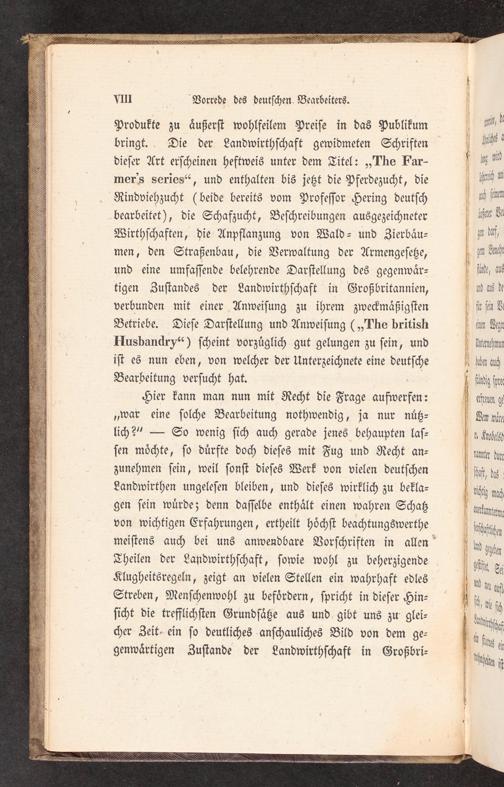 Hier kann man nun mit Recht die Frage aufwerfen: „war eine ſolche Bearbeitung nothwendig, ja nur nuͤtz⸗ lich?“— So wenig ſich auch gerade jenes behaupten laſ⸗ ſen moͤchte, ſo duͤrfte doch dieſes mit Fug und Recht an— zunehmen ſein, weil ſonſt dieſes Werk von vielen deutſchen Landwirthen ungeleſen bleiben, und dieſes wirklich zu bekla⸗ gen ſein wuͤrde; denn daſſelbe enthaͤlt einen wahren Schatz von wichtigen Erfahrungen, ertheilt hoͤchſt beachtungswerthe