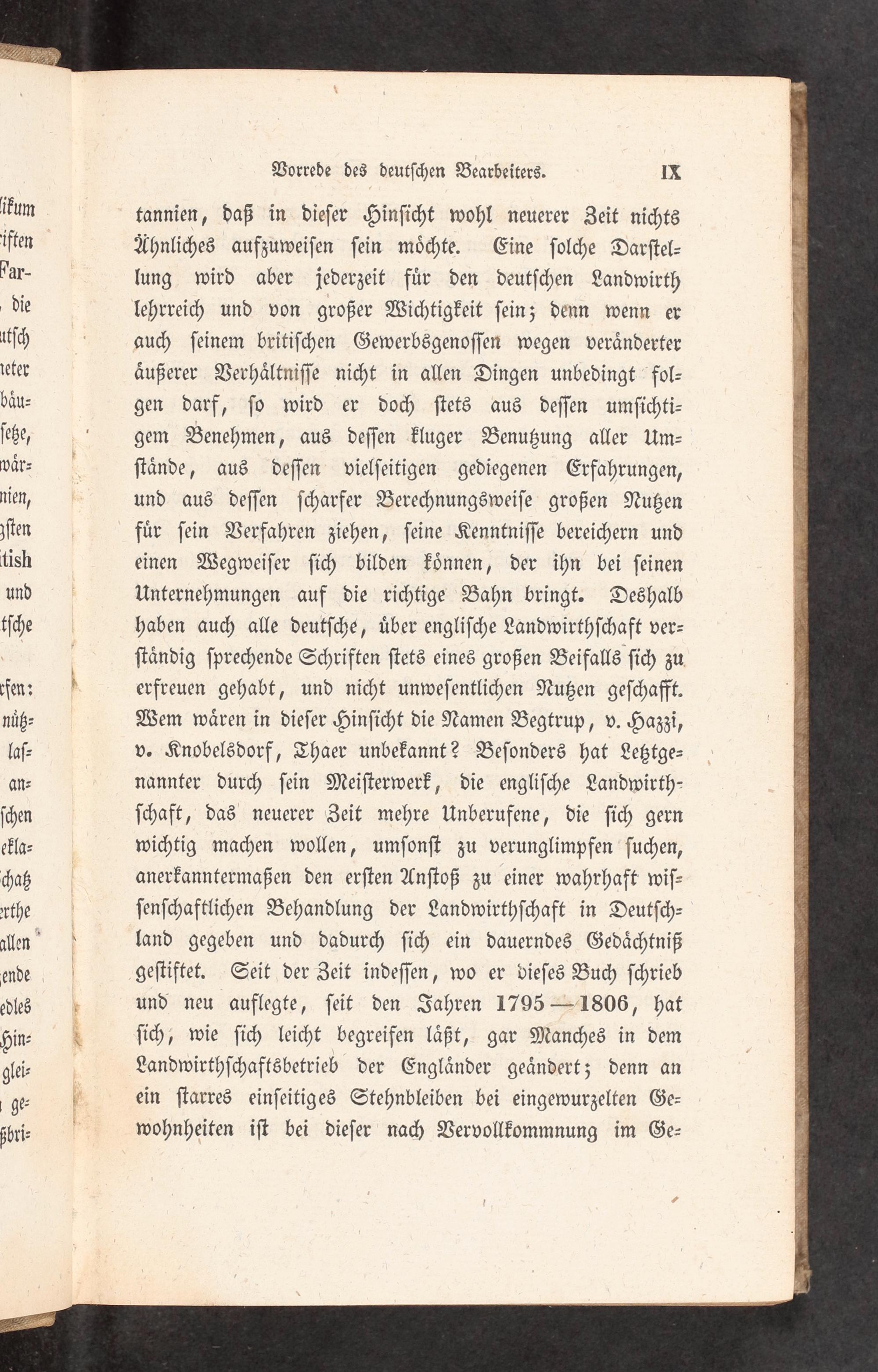 tannien, daß in dieſer Hinſicht wohl neuerer Zeit nichts Ähnliches aufzuweiſen ſein moͤchte. Eine ſolche Darſtel— lung wird aber jederzeit fuͤr den deutſchen Landwirth lehrreich und von großer Wichtigkeit ſein; denn wenn er auch ſeinem britiſchen Gewerbsgenoſſen wegen veraͤnderter aͤußerer Verhaͤltniſſe nicht in allen Dingen unbedingt fol⸗ gen darf, ſo wird er doch ſtets aus deſſen umſichti— gem Benehmen, aus deſſen kluger Benutzung aller Um— ſtaͤnde, aus deſſen vielſeitigen gediegenen Erfahrungen, und aus deſſen ſcharfer Berechnungsweiſe großen Nutzen fuͤr ſein Verfahren ziehen, ſeine Kenntniſſe bereichern und einen Wegweiſer ſich bilden koͤnnen, der ihn bei ſeinen Unternehmungen auf die richtige Bahn bringt. Deshalb haben auch alle deutſche, uͤber engliſche Landwirthſchaft ver⸗ ſtaͤndig ſprechende Schriften ſtets eines großen Beifalls ſich zu erfreuen gehabt, und nicht unweſentlichen Nutzen geſchafft. Wem waͤren in dieſer Hinſicht die Namen Begtrup, v. Hazzi, v. Knobelsdorf, Thaer unbekannt? Beſonders hat Letztge⸗ nannter durch ſein Meiſterwerk, die engliſche Landwirth⸗ ſchaft, das neuerer Zeit mehre Unberufene, die ſich gern wichtig machen wollen, umſonſt zu verunglimpfen ſuchen, anerkanntermaßen den erſten Anſtoß zu einer wahrhaft wiſ— ſenſchaftlichen Behandlung der Landwirthſchaft in Deutſch⸗ land gegeben und dadurch ſich ein dauerndes Gedaͤchtniß