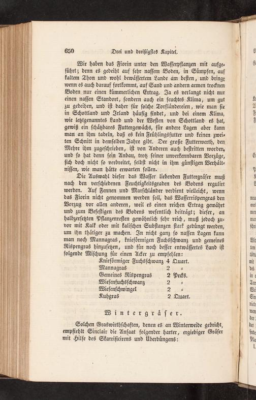 Solchen Graswirthſchaften, denen es an Winterweide gebricht, empfiehlt Sinclair die Anſaat folgender harter, ergiebiger Graͤſer mit Hilfe des Skarrificirens und Überduͤngens:
