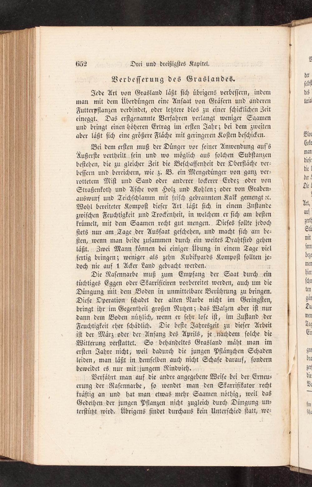 Jede Art von Grasland laͤßt ſich uͤbrigens verbeſſern, indem man mit dem überduͤngen eine Anſaat von Graͤſern und anderen Futterpflanzen verbindet, oder letztere blos zu einer ſchicklichen Zeit eineggt. Das erſtgenannte Verfahren verlangt weniger Saamen und bringt einen hoͤheren Ertrag im erſten Jahr; bei dem zweiten aber laͤßt ſich eine groͤßere Flaͤche mit geringeren Koſten beſchicken.