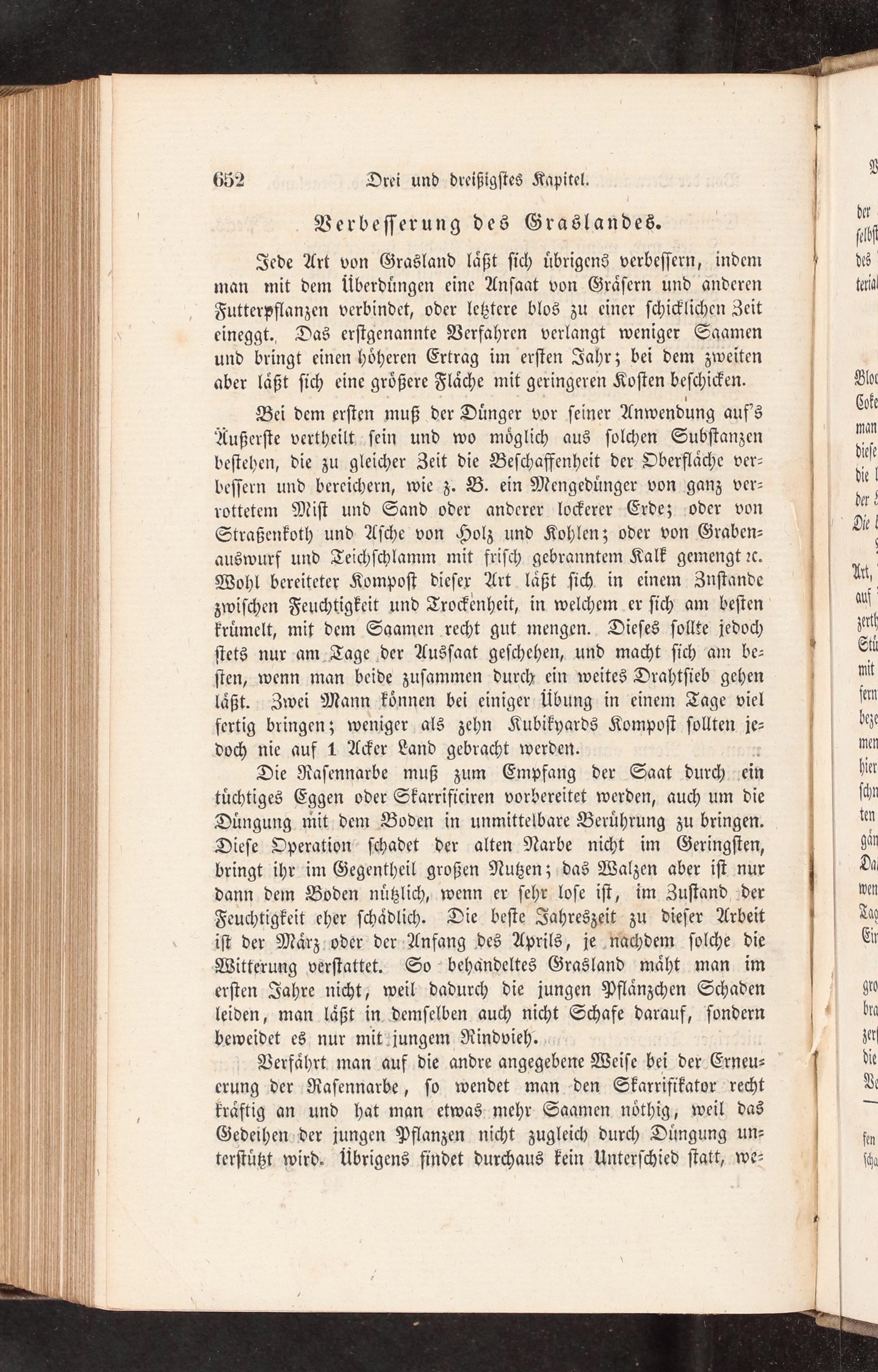 Die Raſennarbe muß zum Empfang der Saat durch ein tuͤchtiges Eggen oder Skarrificiren vorbereitet werden, auch um die Duͤngung mit dem Boden in unmittelbare Berührung zu bringen. Dieſe Operation ſchadet der alten Narbe nicht im Geringſten, bringt ihr im Gegentheil großen Nutzen; das Walzen aber iſt nur dann dem Boden nuͤtzlich, wenn er ſehr loſe iſt, im Zuſtand der Feuchtigkeit eher ſchaͤdlich. Die beſte Jahreszeit zu dieſer Arbeit iſt der Maͤrz oder der Anfang des Aprils, je nachdem ſolche die Witterung verſtattet. So behandeltes Grasland maͤht man im erſten Jahre nicht, weil dadurch die jungen Pflaͤnzchen Schaden leiden, man laͤßt in demſelben auch nicht Schafe darauf, ſondern beweidet es nur mit jungem Rindvieh.