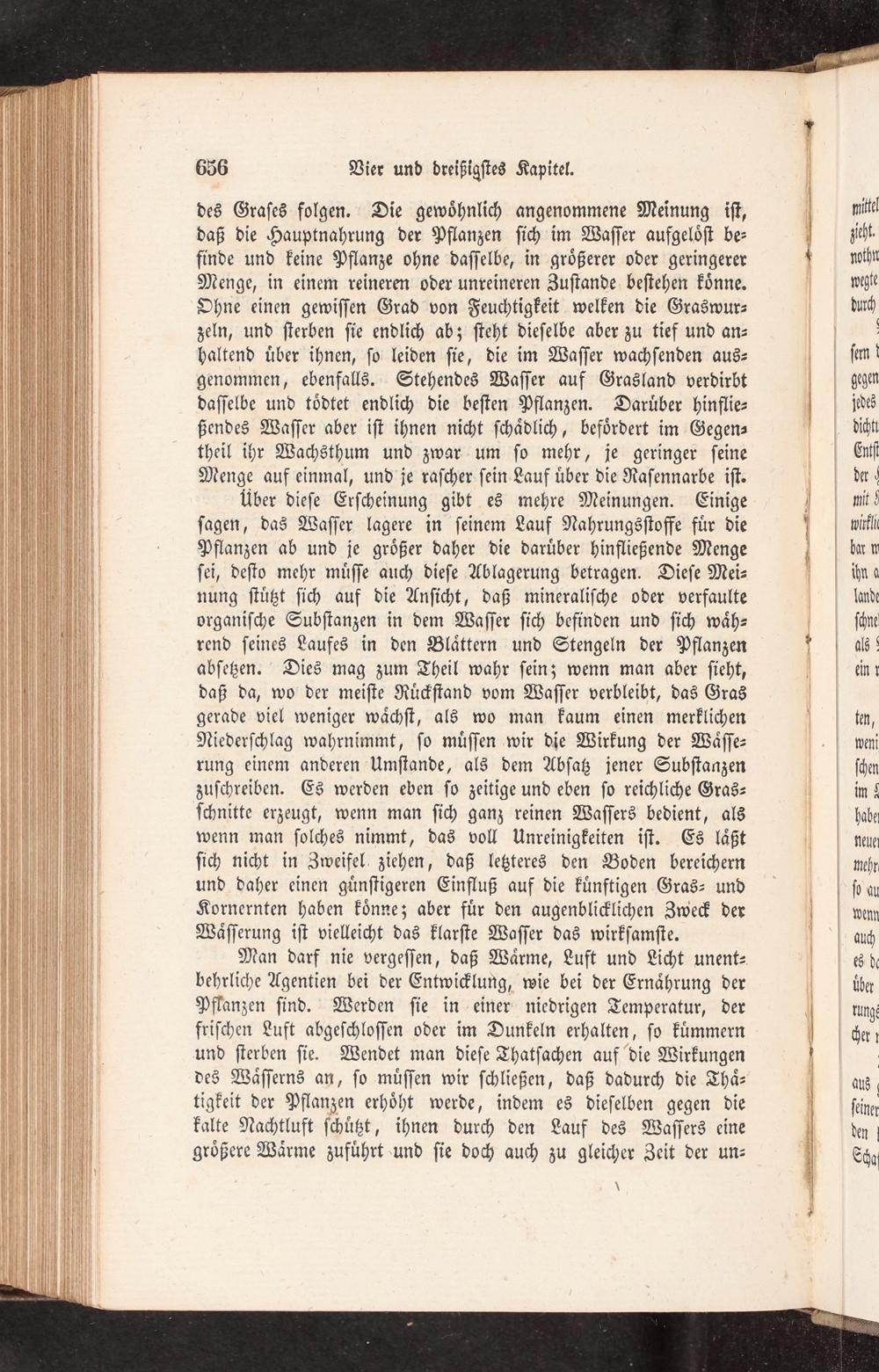des Graſes folgen. Die gewoͤhnlich angenommene Meinung iſt, daß die Hauptnahrung der Pflanzen ſich im Waſſer aufgeloͤſt be⸗ finde und keine Pflanze ohne daſſelbe, in groͤßerer oder geringerer Menge, in einem reineren oder unreineren Zuſtande beſtehen koͤnne. Ohne einen gewiſſen Grad von Feuchtigkeit welken die Graswur⸗ zeln, und ſterben ſie endlich ab; ſteht dieſelbe aber zu tief und an— haltend uͤber ihnen, ſo leiden ſie, die im Waſſer wachſenden aus— genommen, ebenfalls. Stehendes Waſſer auf Grasland verdirbt daſſelbe und toͤdtet endlich die beſten Pflanzen. Daruͤber hinflie— ßendes Waſſer aber iſt ihnen nicht ſchaͤdlich, befoͤrdert im Gegen— theil ihr Wachsthum und zwar um ſo mehr, je geringer ſeine Menge auf einmal, und je raſcher ſein Lauf uͤber die Raſennarbe iſt. über dieſe Erſcheinung gibt es mehre Meinungen. Einige ſagen, das Waſſer lagere in ſeinem Lauf Nahrungsſtoffe fuͤr die Pflanzen ab und je groͤßer daher die daruͤber hinfließende Menge ſei, deſto mehr muͤſſe auch dieſe Ablagerung betragen. Dieſe Mei⸗ nung ſtuͤtzt ſich auf die Anſicht, daß mineraliſche oder verfaulte organiſche Subſtanzen in dem Waſſer ſich befinden und ſich waͤh— rend ſeines Laufes in den Blaͤttern und Stengeln der Pflanzen abſetzen. Dies mag zum Theil wahr ſein; wenn man aber ſieht, daß da, wo der meiſte Ruͤckſtand vom Waſſer verbleibt, das Gras gerade viel weniger waͤchſt, als wo man kaum einen merklichen Niederſchlag wahrnimmt, ſo muͤſſen wir die Wirkung der Waͤſſe— rung einem anderen Umſtande, als dem Abſatz jener Subſtanzen zuſchreiben. Es werden eben ſo zeitige und eben ſo reichliche Gras— ſchnitte erzeugt, wenn man ſich ganz reinen Waſſers bedient, als wenn man ſolches nimmt, das voll Unreinigkeiten iſt. Es laͤßt ſich nicht in Zweifel ziehen, daß letzteres den Boden bereichern und daher einen guͤnſtigeren Einfluß auf die kuͤnftigen Gras- und Kornernten haben koͤnne; aber fuͤr den augenblicklichen Zweck der Waͤſſerung iſt vielleicht das klarſte Waſſer das wirkſamſte.