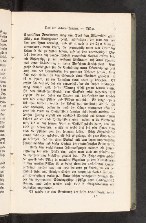 theoretiſchen Erperimente mag zum Theil den Widerwillen gegen Alles, was Verbeſſerung heißt, rechtfertigen, den man den mei⸗ ſten von ihnen vorwirft, und es iſt auch in der That kaum zu verwundern, wenn Leute, die gegenwaͤrtig unter dem Druck der Zeiten ſo viel zu dulden haben, und bei dem unermeßlichen Ver⸗ luſt, den das auf Landwirthſchaft verwendete Kapital erlitten hat, mit Beſorgniß, ja mit wahrem Mißtrauen auf Alles ſchauen, was einer Abaͤnderung in ihrem Verfahren aͤhnlich ſieht. Eine große Schwierigkeit fuͤr die Einfuͤhrung neuer Ackerwerkzeuge geht auch aus den Vorurtheilen der gemeinen Arbeiter hervor; denn ſind dieſe einmal an den Gebrauch eines Geraͤthes gewoͤhnt, ſo iſt es ſchwer, ſie zur Annahme eines neuen zu bewegen. Es ergibt ſich daraus, daß ein Landwirth, der ein ſolches in Anwen⸗ dung bringen will, deſſen Fuͤhrung ſelbſt genau kennen muͤſſe. In dem Wirthſchaftsbericht von Stafford wird folgender Fall erzaͤhlt: Es zog dahin ein Pachter aus Leiceſterſhire und brachte von hier einige Pfluͤge und Pfluͤger mit ſich. So lange letztere bei ihm blieben, wurde die Arbeit gut verrichtet; als ſie ihn aber verließen, haͤtten ſie auch die Pfluͤge mitnehmen koͤnnen; denn die Leute in Staffordſhire konnten nicht damit arbeiten.— Arthur Young erzaͤhlt ein aͤhnliches Beiſpiel aus ſeinem eignen Leben: als er nach Hertfordſhire ging, nahm er die Werkzeuge mit, die er auf ſeinem Gute in Suffolk gehabt hatte, und um dieſe zu gebrauchen, mußte er wohl drei bis vier Jahre lang auch die Pfluͤger von hier kommen laſſen. Dieſe Schwierigkeit wurde nicht eher gehoben, als bis es gelang, ein paar Eingeborne zu beſtechen, daß ſie einen Verſuch mit dem ihnen ungewohnten Pfluge machten und dieſer Verſuch den erwuͤnſchteſten Erfolg hatte.