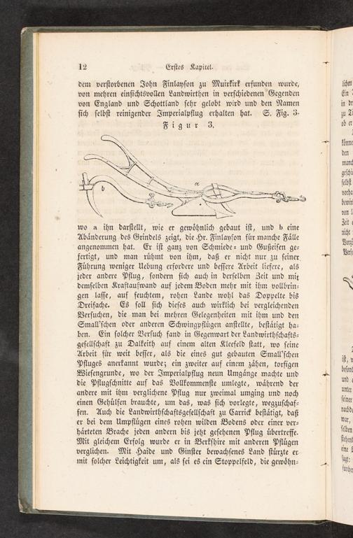 wo a ihn darſtellt, wie er gewoͤhnlich gebaut iſt, und b eine Abaͤnderung des Grindels zeigt, die Hr. Finlayſon fuͤr manche Faͤlle angenommen hat. Er iſt ganz von Schmiede⸗ und Gußeiſen ge⸗ fertigt, und man ruͤhmt von ihm, daß er nicht nur zu ſeiner Fuͤhrung weniger Uebung erfordere und beſſere Arbeit liefere, als jeder andere Pflug, ſondern ſich auch in derſelben Zeit und mit demſelben Kraftaufwand auf jedem Boden mehr mit ihm vollbrin— gen laſſe, auf feuchtem, rohen Lande wohl das Doppelte bis Dreifache. Es ſoll ſich dieſes auch wirklich bei vergleichenden Verſuchen, die man bei mehren Gelegenheiten mit ihm und den Small'ſchen oder anderen Schwingpfluͤgen anſtellte, beſtaͤtigt ha— ben. Ein ſolcher Verſuch fand in Gegenwart der Landwirthſchafts⸗ geſellſchaft zu Dalkeith auf einem alten Kleefeld ſtatt, wo ſeine Arbeit fuͤr weit beſſer, als die eines gut gebauten Small'ſchen Pfluges anerkannt wurde; ein zweiter auf einem zaͤhen, torfigen Wieſengrunde, wo der Imperialpflug neun Umgaͤnge machte und die Pflugſchnitte auf das Vollkommenſte umlegte, waͤhrend der andere mit ihm verglichene Pflug nur zweimal umging und noch einen Gehuͤlfen brauchte, um das, was ſich vorlegte, wegzuſchaf— fen. Auch die Landwirthſchaftsgeſellſchaft zu Carrick beſtaͤtigt, daß er bei dem Umpfluͤgen eines rohen wilden Bodens oder einer ver⸗ haͤrteten Brache jeden andern bis jetzt geſehenen Pflug uͤbertreffe. Mit gleichem Erfolg wurde er in Berkſhire mit anderen Pfluͤgen verglichen. Mit Haide und Ginſter bewachſenes Land ſtuͤrzte er mit ſolcher Leichtigkeit um, als ſei es ein Stoppelfeld, die gewoͤhn⸗