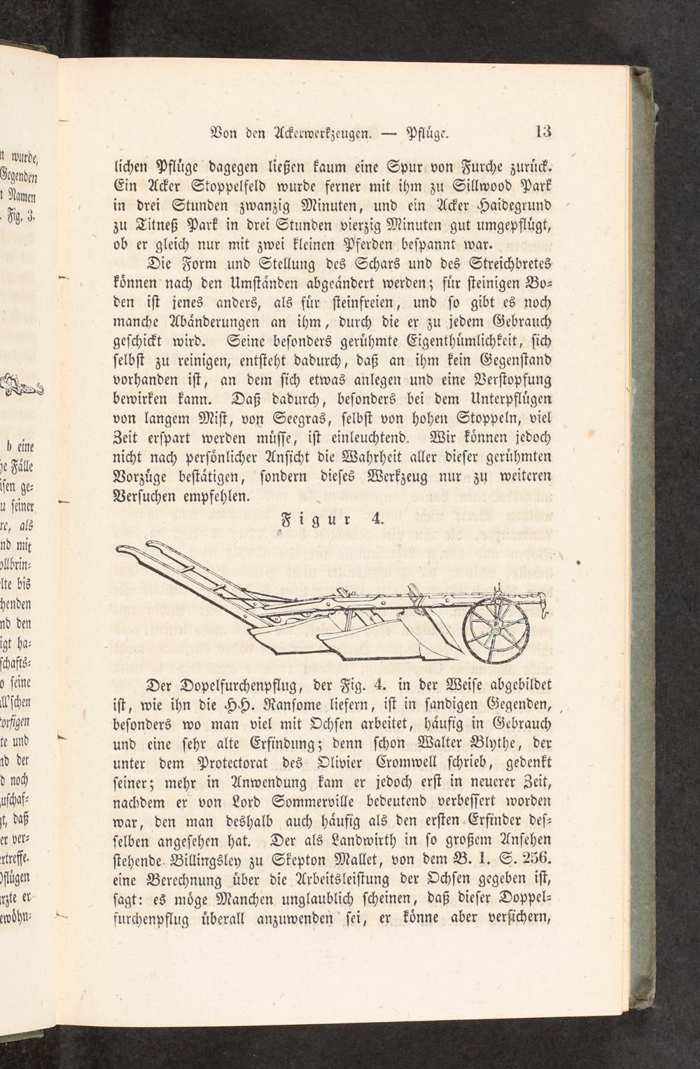 Der Dopelfurchenpflug, der Fig. 4. in der Weiſe abgebildet iſt, wie ihn die HH. Ranſome liefern, iſt in ſandigen Gegenden, beſonders wo man viel mit Ochſen arbeitet, haͤufig in Gebrauch und eine ſehr alte Erfindung; denn ſchon Walter Blythe, der unter dem Protectorat des Olivier Cromwell ſchrieb, gedenkt ſeiner; mehr in Anwendung kam er jedoch erſt in neuerer Zeit, nachdem er von Lord Sommerville bedeutend verbeſſert worden war, den man deshalb auch haͤufig als den erſten Erfinder deſ— ſelben angeſehen hat. Der als Landwirth in ſo großem Anſehen ſtehende Billingsley zu Skepton Mallet, von dem B. 1. S. 256. eine Berechnung uͤber die Arbeitsleiſtung der Ochſen gegeben iſt, ſagt: es moͤge Manchen unglaublich ſcheinen, daß dieſer Doppel— furchenpflug uͤberall anzuwenden ſei, er koͤnne aber verſichern,