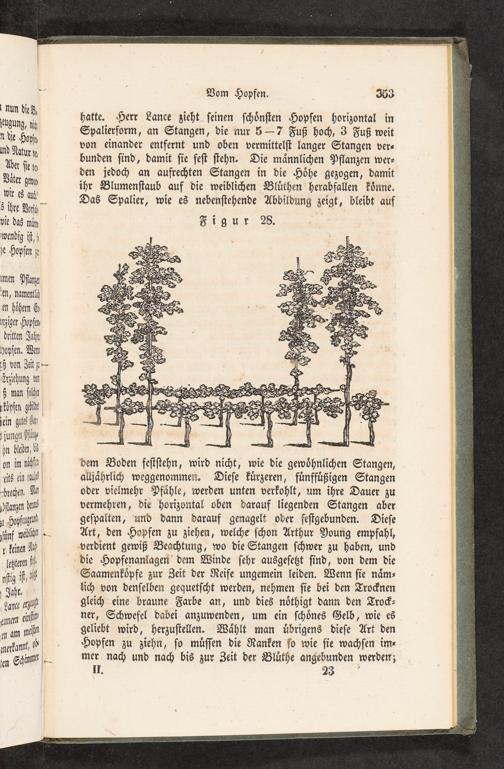dem Boden feſtſtehn, wird nicht, wie die gewoͤhnlichen Stangen, alljaͤhrlich weggenommen. Dieſe kuͤrzeren, fuͤnffuͤßigen Stangen oder vielmehr Pfaͤhle, werden unten verkohlt, um ihre Dauer zu vermehren, die horizontal oben darauf liegenden Stangen aber geſpalten, und dann darauf genagelt oder feſtgebunden. Dieſe Art, den Hopfen zu ziehen, welche ſchon Arthur Young empfahl, verdient gewiß Beachtung, wo die Stangen ſchwer zu haben, und die Hopfenanlagen dem Winde ſehr ausgeſetzt ſind, von dem die Saamenkoͤpfe zur Zeit der Reife ungemein leiden. Wenn ſie naͤm⸗ lich von denſelben gequetſcht werden, nehmen ſie bei den Trocknen gleich eine braune Farbe an, und dies noͤthigt dann den Trock⸗ ner, Schwefel dabei anzuwenden, um ein ſchoͤnes Gelb, wie es geliebt wird, herzuſtellen. Waͤhlt man uͤbrigens dieſe Art den Hopfen zu ziehn, ſo muͤſſen die Ranken ſo wie ſie wachſen im⸗ mer nach und nach bis zur Zeit der Bluͤthe angebunden werden; II. 23
