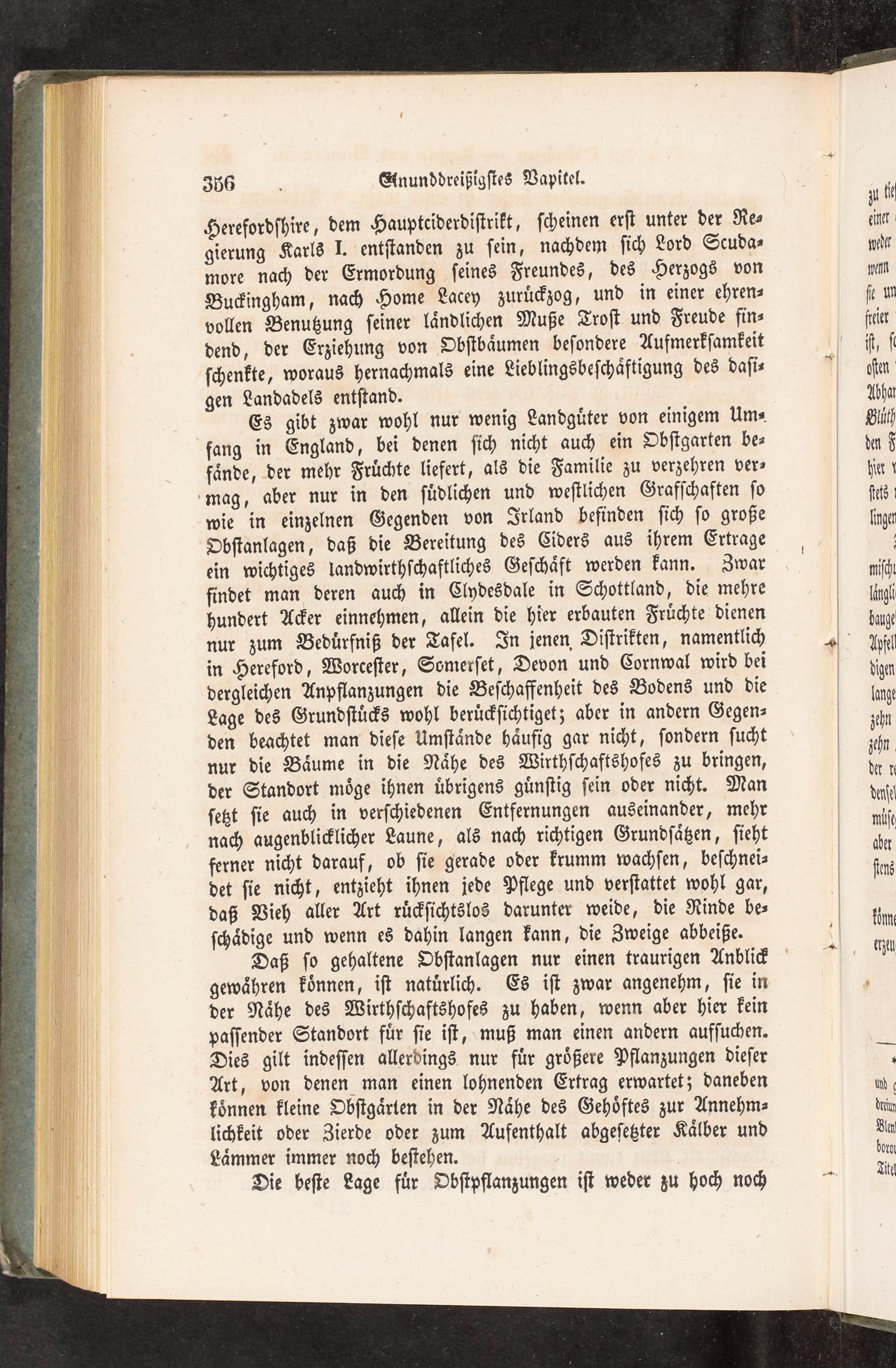 Es gibt zwar wohl nur wenig Landguͤter von einigem Um⸗ fang in England, bei denen ſich nicht auch ein Obſtgarten be⸗ faͤnde, der mehr Fruͤchte liefert, als die Familie zu verzehren ver⸗ mag, aber nur in den ſuͤdlichen und weſtlichen Grafſchaften ſo wie in einzelnen Gegenden von Irland befinden ſich ſo große Obſtanlagen, daß die Bereitung des Ciders aus ihrem Ertrage ein wichtiges landwirthſchaftliches Geſchaͤft werden kann. Zwar findet man deren auch in Clydesdale in Schottland, die mehre hundert Acker einnehmen, allein die hier erbauten Fruͤchte dienen nur zum Beduͤrfniß der Tafel. In jenen Diſtrikten, namentlich in Hereford, Worceſter, Somerſet, Devon und Cornwal wird bei dergleichen Anpflanzungen die Beſchaffenheit des Bodens und die Lage des Grundſtuͤcks wohl beruͤckſichtiget; aber in andern Gegen⸗ den beachtet man dieſe Umſtaͤnde haͤufig gar nicht, ſondern ſucht nur die Baͤume in die Naͤhe des Wirthſchaftshofes zu bringen, der Standort moͤge ihnen uͤbrigens guͤnſtig ſein oder nicht. Man ſetzt ſie auch in verſchiedenen Entfernungen auseinander, mehr nach augenblicklicher Laune, als nach richtigen Grundſaͤtzen, ſieht ferner nicht darauf, ob ſie gerade oder krumm wachſen, beſchnei⸗ det ſie nicht, entzieht ihnen jede Pflege und verſtattet wohl gar, daß Vieh aller Art ruͤckſichtslos darunter weide, die Rinde be⸗ ſchaͤdige und wenn es dahin langen kann, die Zweige abbeiße.