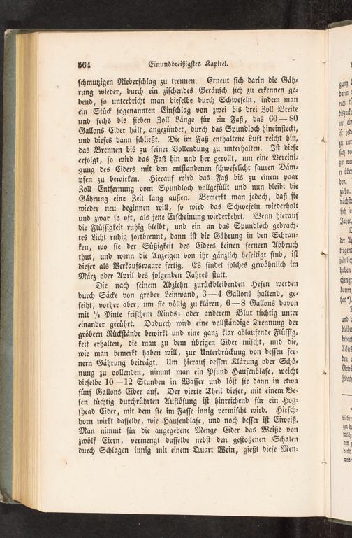 ſchmutzigen Niederſchlag zu trennen. Erneut ſich darin die Gaͤh⸗ rung wieder, durch ein ziſchendes Geraͤuſch ſich zu erkennen ge⸗ bend, ſo unterbricht man dieſelbe durch Schwefeln, indem man ein Stuͤck ſogenannten Einſchlag von zwei bis drei Zoll Breite und ſechs bis ſieben Zoll Laͤnge fuͤr ein Faß, das 60— 80 Gallons Cider haͤlt, angezuͤndet, durch das Spundloch hineinſteckt, und dieſes dann ſchließt. Die im Faß enthaltene Luft reicht hin, das Brennen bis zu ſeiner Vollendung zu unterhalten. Iſt dieſe erfolgt, ſo wird das Faß hin und her gerollt, um eine Vereini⸗ gung des Ciders mit den entſtandenen ſchwefelicht ſauren Daͤm⸗ pfen zu bewirken. Hierauf wird das Faß bis zu einem paar Zoll Entfernung vom Spundloch vollgefuͤllt und nun bleibt die Gaͤhrung eine Zeit lang außen. Bemerkt man jedoch, daß ſie wieder neu beginnen will, ſo wird das Schwefeln wiederholt und zwar ſo oft, als jene Erſcheinung wiederkehrt. Wenn hierauf die Fluͤſſigkeit ruhig bleibt, und ein an das Spundloch gebrach— tes Licht ruhig fortbrennt, dann iſt die Gaͤhrung in den Schran⸗ ken, wo ſie der Suͤßigkeit des Ciders keinen fernern Abbruch thut, und wenn die Anzeigen von ihr gaͤnzlich beſeitigt ſind, iſt dieſer als Verkaufswaare fertig. Es findet ſolches gewoͤhnlich im Maͤrz oder April des folgenden Jahres ſtatt.
