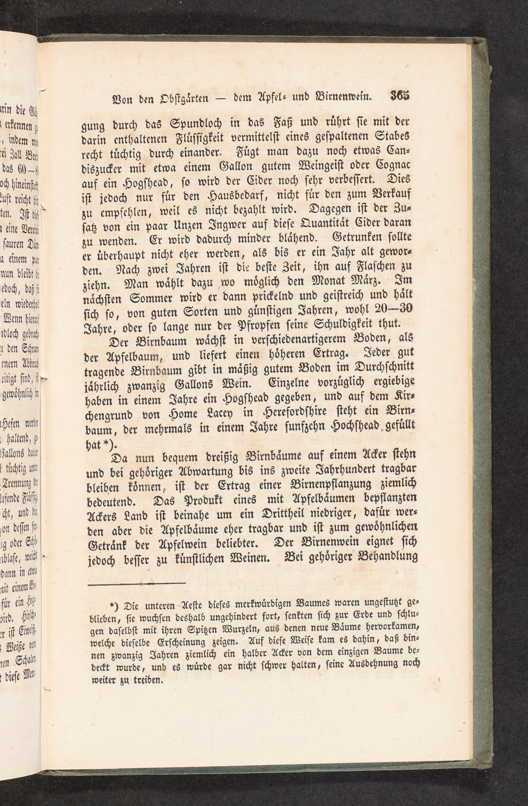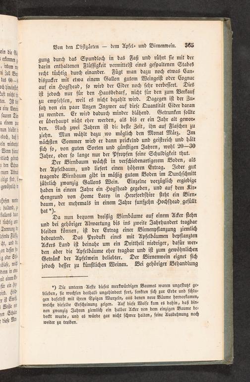 Der Birnbaum waͤchſt in verſchiedenartigerem Boden, als der Apfelbaum, und liefert einen hoͤheren Ertrag. Jeder gut tragende Birnbaum gibt in maͤßig gutem Boden im Durchſchnitt jaͤhrlich zwanzig Gallons Wein. Einzelne vorzuͤglich ergiebige haben in einem Jahre ein Hogſhead gegeben, und auf dem Kir⸗ chengrund von Home Lacey in Herefordſhire ſteht ein Birn⸗ baum, der mehrmals in einem Jahre ſunfzehn Hochſhead gefuͤllt hat*).