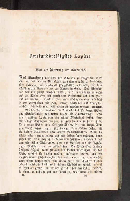 Nach Beendigung des uͤber den Ackerbau zu Sagenden haben wir nun das in einer Wirthſchaft zu haltende Vieh zu betrachten, oder vielmehr, wie Bakewell ſich gluͤcklich ausdruͤckte, die beſte Maſchine zur Verwandlung des Futters in Geld. Das Rindvieh, von dem wir zuerſt ſprechen wollen, wird im Sommer entweder auf der Weide oder mit gemaͤhetem Gruͤnfutter auf dem Hofe, und im Winter in Staͤllen, oder unter Schuppen oder auch blos in den Strohhoͤfen mit Heu, Stroh, Oelkuchen und Wurzelge— waͤchſen, die bald roh, bald gedaͤmpft gegeben werden, erhalten.