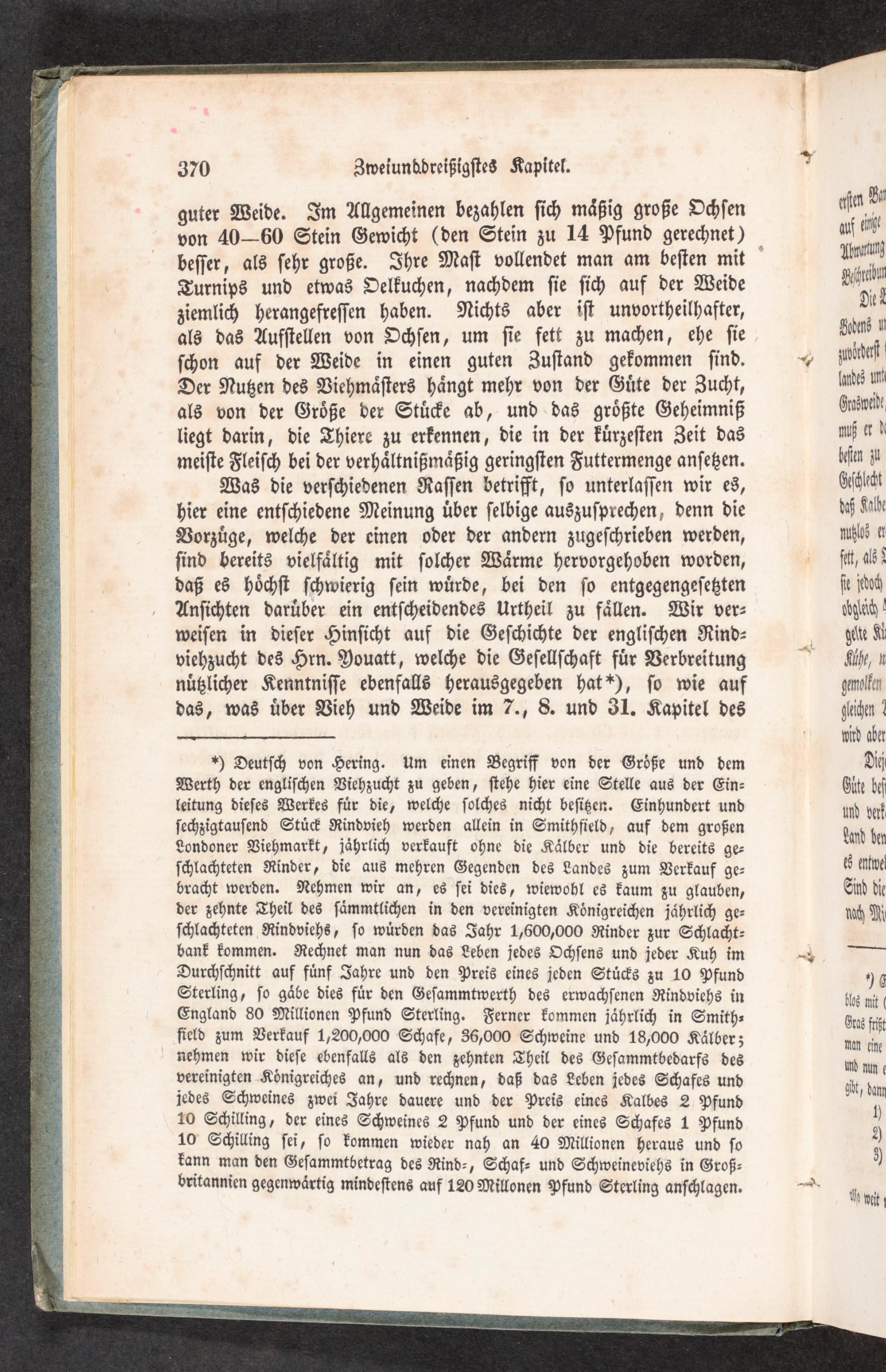 370 Zweiunddreißigſtes Kapitel. 7 guter Weide. Im Allgemeinen bezahlen ſich maͤßig große Ochſen rin Re von 40— 60 Stein Gewicht(den Stein zu 14 Pfund gerechnet) auf 3 beſſer, als ſehr große. Ihre Maſt vollendet man am beſten mit iauns Turnips und etwas Oelkuchen, nachdem ſie ſich auf der Weide idun ziemlich herangefreſſen haben. Nichts aber iſt unvortheilhafter, 1 als das Aufſtellen von Ochſen, um ſie fett zu machen, ehe ſie udnd u ſchon auf der Weide in einen guten Zuſtand gekommen ſind.„ uideſt Der Nutzen des Viehmaͤſters haͤngt mehr von der Guͤte der Zucht, lndes un als von der Groͤße der Stuͤcke ab, und das groͤßte Geheimniß Grasweide liegt darin, die Thiere zu erkennen, die in der kuͤrzeſten Zeit das ni erd meiſte Fleiſch bei der verhaͤltnißmaͤßig geringſten Futtermenge anſetzen. beſten zu Was die verſchiedenen Raſſen betrifft, ſo unterlaſſen wir es, Geſchech hier eine entſchiedene Meinung uͤber ſelbige auszuſprechen, denn die dß Kab Vorzuͤge, welche der einen oder der andern zugeſchrieben werden, nütos er ſind bereits vielfaͤltig mit ſolcher Waͤrme hervorgehoben worden, ft, ab? daß es hoͤchſt ſchwierig ſein wuͤrde, bei den ſo entgegengeſetzten ſie jadoch Anſichten daruͤber ein entſcheidendes Urtheil zu faͤllen. Wir ver⸗ dgläch! weiſen in dieſer Hinſicht auf die Geſchichte der engliſchen Rind⸗ An viehzucht des Hrn. Youatt, welche die Geſellſchaft fuͤr Verbreitung ühe, nuͤtzlicher Kenntniſſe ebenfalls herausgegeben hat*), ſo wie auf gemolken das, was uͤber Vieh und Weide im 7., 8. und 31. Kapitel des gleichen eid abe *) Deutſch von Hering. Um einen Begriff von der Groͤße und dem Dia Werth der engliſchen Viehzucht zu geben, ſtehe hier eine Stelle aus der Ein⸗ Güte beſ leitung dieſes Werkes fuͤr die, welche ſolches nicht beſitzen. Einhundert und und verk ſechzigtauſend Stuͤck Rindvieh werden allein in Smithfield, auf dem großen dand ber Londoner Viehmarkt, jaͤhrlich verkauft ohne die Kaͤlber und die bereits ge⸗ ſchlachteten Rinder, die aus mehren Gegenden des Landes zum Verkauf ge⸗ ds entwe bracht werden. Nehmen wir an, es ſei dies, wiewohl es kaum zu glauben, Oind die der zehnte Theil des ſaͤmmtlichen in den vereinigten Koͤnigreichen jaͤhrlich ge⸗ dach M. ſchlachteten Rindviehs, ſo wuͤrden das Jahr 1,600,000 Rinder zur Schlacht⸗ bank kommen. Rechnet man nun das Leben jedes Ochſens und jeder Kuh im„öö Durchſchnitt auf fuͤnf Jahre und den Preis eines jeden Stuͤcks zu 10 Pfund)6 Sterling, ſo gaͤbe dies fuͤr den Geſammtwerth des erwachſenen Rindviehs in llos mit England 80 Millionen Pfund Sterling. Ferner kommen jaͤhrlich in Smith⸗ ras fit field zum Verkauf 1,200,000 Schafe, 36,000 Schweine und 18,000 Kaͤlber; nnn eine nehmen wir dieſe ebenfalls als den zehnten Theil des Geſammtbedarfs des und nun vereinigten Koͤnigreiches an, und rechnen, daß das Leben jedes Schafes und git,d jedes Schweines zwei Jahre dauere und der Preis eines Kalbes 2 Pfund Vnih 10 Schilling, der eines Schweines 2 Pfund und der eines Schafes 1 Pfund 3