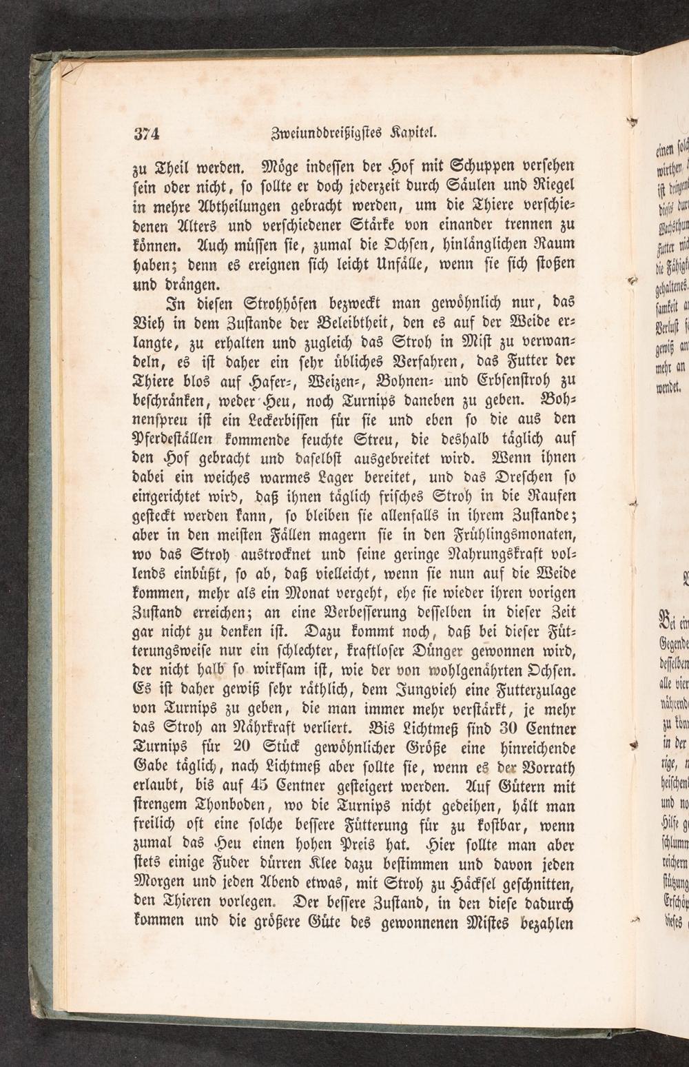 374 Zweiunddreißigſtes Kapitel. i i inen ſod zu Theil werden. Moͤge indeſſen der Hof mit Schuppen verſehen urhn ſein oder nicht, ſo ſollte er doch jederzeit durch Saͤulen und Riegel ſt dygen in mehre Abtheilungen gebracht werden, um die Thiere verſchie⸗ diſs du denen Alters und verſchiedener Staͤrke von einander trennen zu Aagathun köͤnnen. Auch muͤſſen ſie, zumal die Ochſen, hinlaͤnglichen Raum luttt ric haben; denn es ereignen ſich leicht Unfaͤlle, wenn ſie ſich ſtoßen je Fhi und draͤngen.*ghaltne In dieſen Strohhoͤfen bezweckt man gewoͤhnlich nur, das ſmki u Vieh in dem Zuſtande der Beleibtheit, den es auf der Weide er⸗ Lalſt langte, zu erhalten und zugleich das Stroh in Miſt zu verwan⸗ gnij m deln, es iſt daher ein ſehr uͤbliches Verfahren, das Futter der ne m Thiere blos auf Hafer⸗, Weizen⸗, Bohnen⸗ und Erbſenſtroh zu nt. beſchraͤnken, weder Heu, noch Turnips daneben zu geben. Boh⸗ nenſpreu iſt ein Leckerbiſſen fuͤr ſie und eben ſo die aus den Pferdeſtaͤllen kommende feuchte Streu, die deshalb taͤglich auf den Hof gebracht und daſelbſt ausgebreitet wird. Wenn ihnen dabei ein weiches warmes Lager bereitet, und das Dreſchen ſo eingerichtet wird, daß ihnen taͤglich friſches Stroh in die Raufen 4 geſteckt werden kann, ſo bleiben ſie allenfalls in ihrem Zuſtande; aber in den meiſten Faͤllen magern ſie in den Fruͤhlingsmonaten, wo das Stroh austrocknet und ſeine geringe Nahrungskraft vol⸗ lends einbuͤßt, ſo ab, daß vielleicht, wenn ſie nun auf die Weide kommen, mehr als ein Monat vergeht, ehe ſie wieder ihren vorigen Zuſtand erreichen; an eine Verbeſſerung deſſelben in dieſer Zeit Bic gar nicht zu denken iſt. Dazu kommt noch, daß bei dieſer Fuͤt— gel terungsweiſe nur ein ſchlechter, kraftloſer Duͤnger gewonnen wird, agnd der nicht halb ſo wirkſam iſt, wie der von wohlgenaͤhrten Ochſen. deſehen Es iſt daher gewiß ſehr raͤthlich, dem Jungvieh eine Futterzulage all rie von Turnips zu geben, die man immer mehr verſtaͤrkt, je mehr nihend das Stroh an Naͤhrkraft verliert. Bis Lichtmeß ſind 30 Centner un in Turnips fuͤr 20 Stuͤck gewoͤhnlicher Groͤße eine hinreichende* in de Gabe taͤglich, nach Lichtmeß aber ſollte ſie, wenn es der Vorrath iige, erlaubt, bis auf 45 Centner geſteigert werden. Auf Guͤtern mit heſſcen ſtrengem Thonboden, wo die Turnips nicht gedeihen, haͤlt man und no freilich oft eine ſolche beſſere Fuͤtterung fuͤr zu koſtbar, wenn dißß g zumal das Heu einen hohen Preis hat. Hier ſollte man aber ſlumn ſtets einige Fuder duͤrren Klee dazu beſtimmen und davon jeden richern Morgen und jeden Abend etwas, mit Stroh zu Haͤckſel geſchnitten, fütung den Thieren vorlegen. Der beſſere Zuſtand, in den dieſe dadurch ſErchi