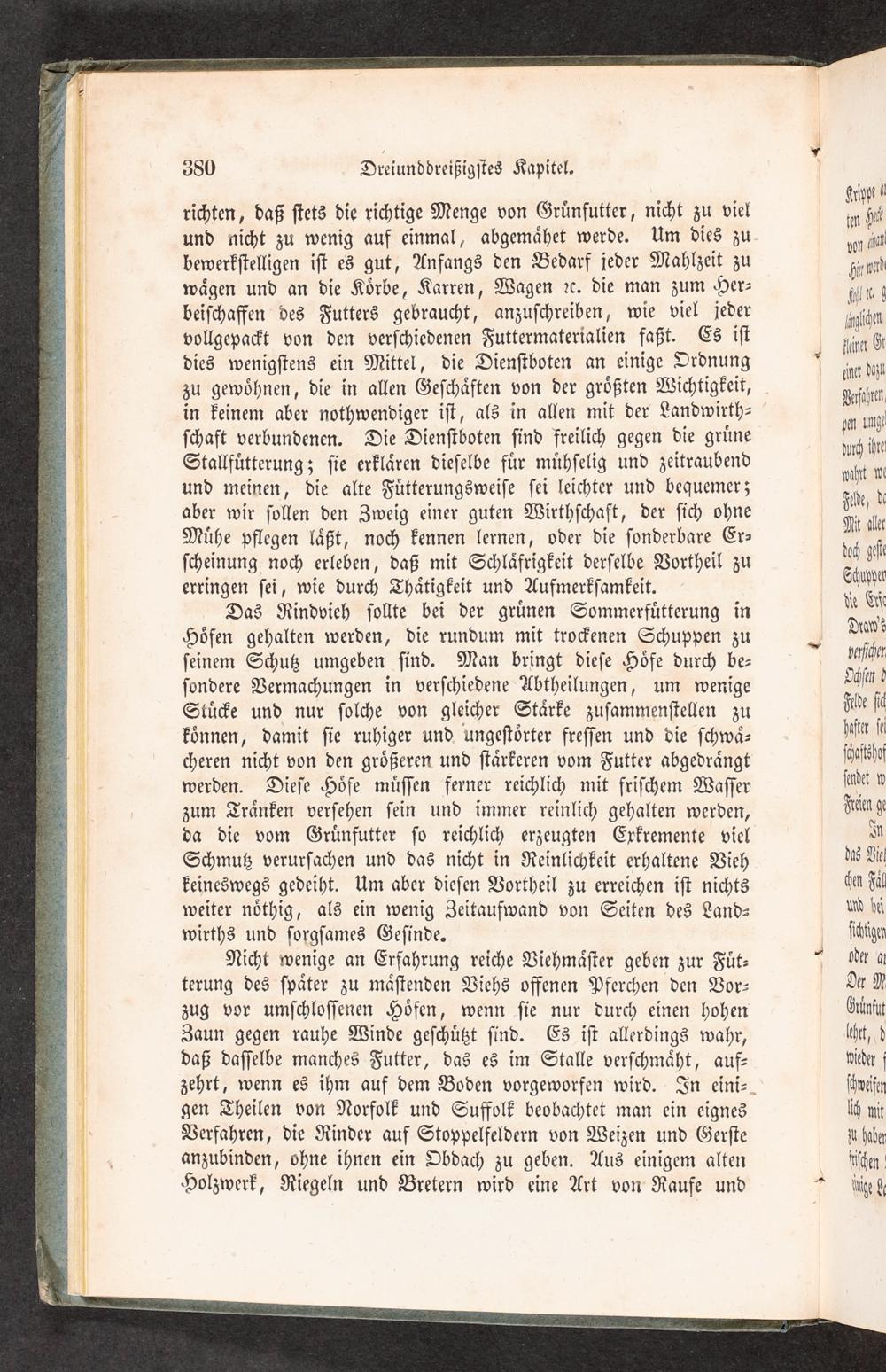 Nicht wenige an Erfahrung reiche Viehmaͤſter geben zur Fuͤt— terung des ſpaͤter zu maͤſtenden Viehs offenen Pferchen den Vor— zug vor umſchloſſenen Hoͤfen, wenn ſie nur durch einen hohen Zaun gegen rauhe Winde geſchuͤtzt ſind. Es iſt allerdings wahr, daß daſſelbe manches Futter, das es im Stalle verſchmaͤht, auf⸗