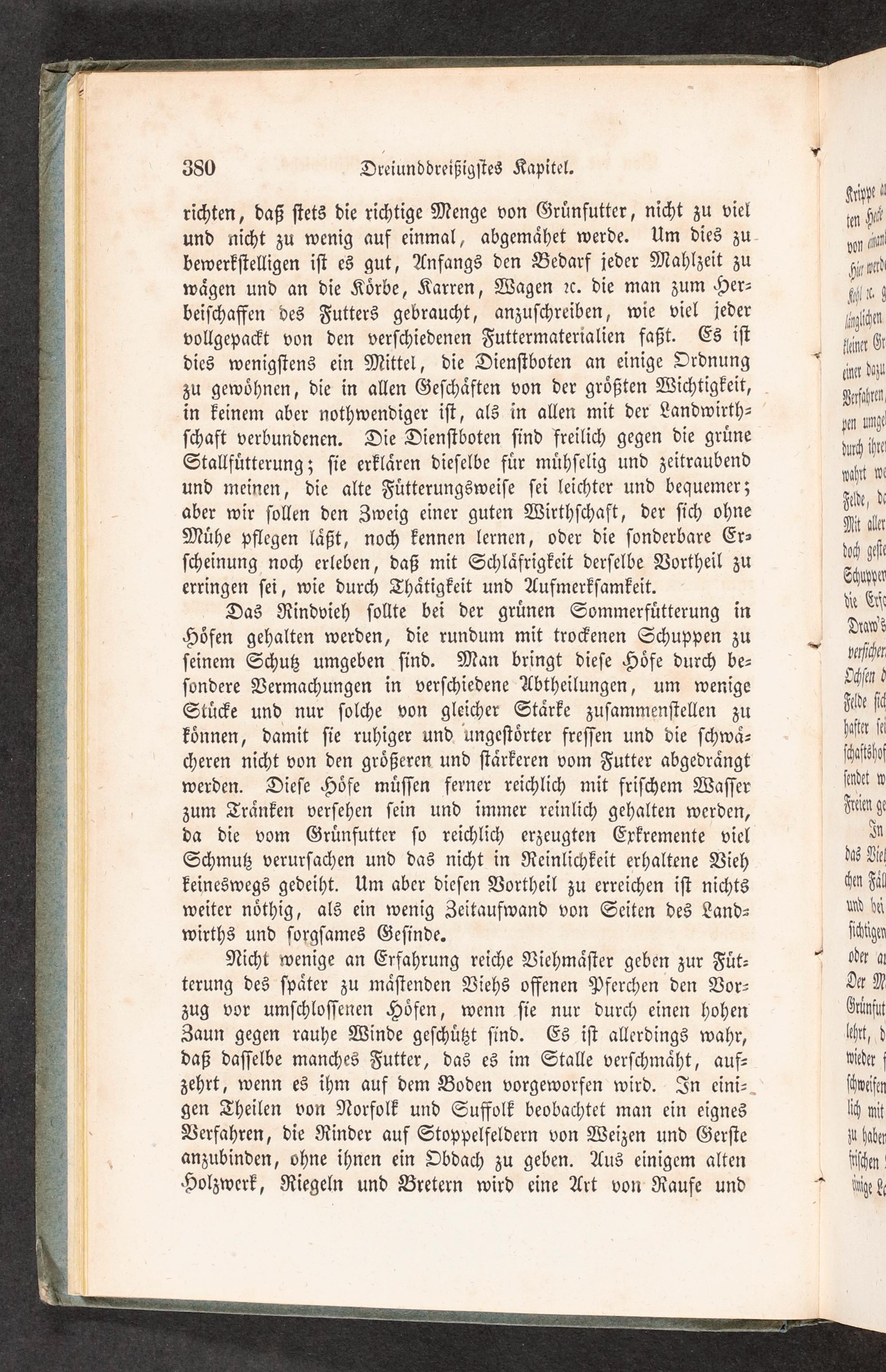 gen Theilen von Norfolk und Suffolk beobachtet man ein eignes Verfahren, die Rinder auf Stoppelfeldern von Weizen und Gerſte anzubinden, ohne ihnen ein Obdach zu geben. Aus einigem alten Holzwerk, Riegeln und Bretern wird eine Art von Raufe und