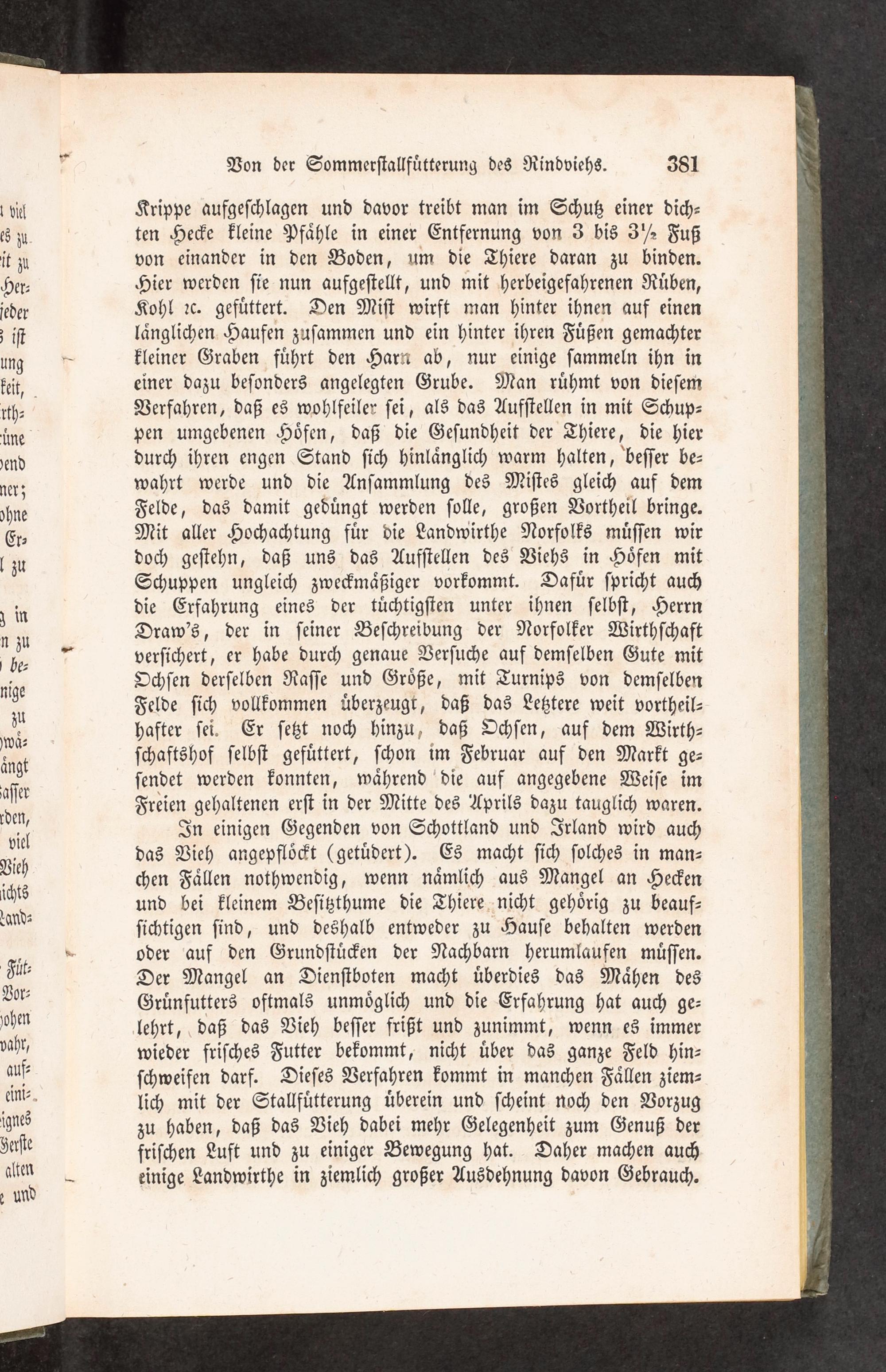Krippe aufgeſchlagen und davor treibt man im Schutz einer dich⸗ ten Hecke kleine Pfaͤhle in einer Entfernung von 3 bis 3½ Fuß von einander in den Boden, um die Thiere daran zu binden. Hier werden ſie nun aufgeſtellt, und mit herbeigefahrenen Ruͤben, Kohl ꝛc. gefuͤttert. Den Miſt wirft man hinter ihnen auf einen laͤnglichen Haufen zuſammen und ein hinter ihren Fuͤßen gemachter kleiner Graben fuͤhrt den Harn ab, nur einige ſammeln ihn in einer dazu beſonders angelegten Grube. Man ruͤhmt von dieſem Verfahren, daß es wohlfeiler ſei, als das Aufſtellen in mit Schup— pen umgebenen Hoͤfen, daß die Geſundheit der Thiere, die hier durch ihren engen Stand ſich hinlaͤnglich warm halten, beſſer be⸗ wahrt werde und die Anſammlung des Miſtes gleich auf dem Felde, das damit geduͤngt werden ſolle, großen Vortheil bringe. Mit aller Hochachtung fuͤr die Landwirthe Norfolks muͤſſen wir doch geſtehn, daß uns das Aufſtellen des Viehs in Hoͤfen mit Schuppen ungleich zweckmaͤßiger vorkommt. Dafuͤr ſpricht auch die Erfahrung eines der tuͤchtigſten unter ihnen ſelbſt, Herrn Draw's, der in ſeiner Beſchreibung der Norfolker Wirthſchaft verſichert, er habe durch genaue Verſuche auf demſelben Gute mit Ochſen derſelben Raſſe und Groͤße, mit Turnips von demſelben Felde ſich vollkommen uͤberzeugt, daß das Letztere weit vortheil— hafter ſei. Er ſetzt noch hinzu, daß Ochſen, auf dem Wirth— ſchaftshof ſelbſt gefuͤttert, ſchon im Februar auf den Markt ge— ſendet werden konnten, waͤhrend die auf angegebene Weiſe im Freien gehaltenen erſt in der Mitte des Aprils dazu tauglich waren.