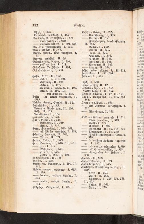Hopfen, Arten, II, 337. — Einfuͤhrung, II, 335. — Ertrag, II, 350. — Fortpflanzung dur m, Feitdſt zung durch Saamen, — Koſten, II, 350. — Kultur, II, 339. Lage, II, 339. — Pflucken, II, 346. — Stangen, II, 343. — Trocknen, II, 348. — Verpacken, II, 349. — Zufaͤlle, II, 354. Hoͤfe, landwirthſchaftl., I, 142. 314. Hufbeſchlag, I, 238. 296. Huͤhner, II, 544.