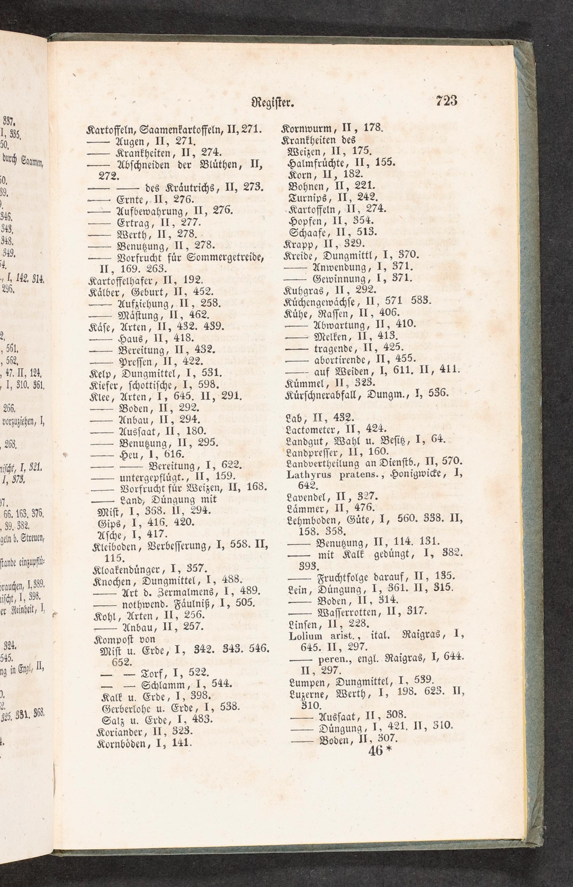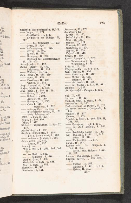 Kartoffelhafer, II, 192. Kaͤlber, Geburt, II, 452. — Aufziehung, II, 258. — Maͤſtung, II, 462. Kaͤſe, Arten, II, 432. 439. — Haus, II, 418. — Bereitung, II, 432. — Preſſen, II, 422. Kelp, Dungmittel, I, 531. Kiefer, ſchottiſche, I, 598. Klee, Arten, I, 645. II, 291. — Boden, II, 292. — Anbau, II, 294. — Ausſaat, II, 180.