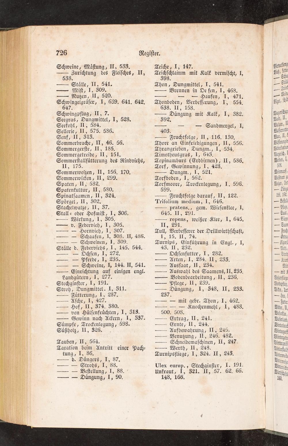 403. — Fruchtfolge, II, 116. 130. Thore an Einfriedigungen, II, 556. Thrangrieben, Dungm., I, 534. Timotheusgras, I, 643. Topinamburs(Erdbirnen), II, 586. Torf, Gewinnung, I, 428. — Dungm., I, 521. Torfboden, I, 562. zoeſinbre⸗ Trockenlegung, 1. 596.