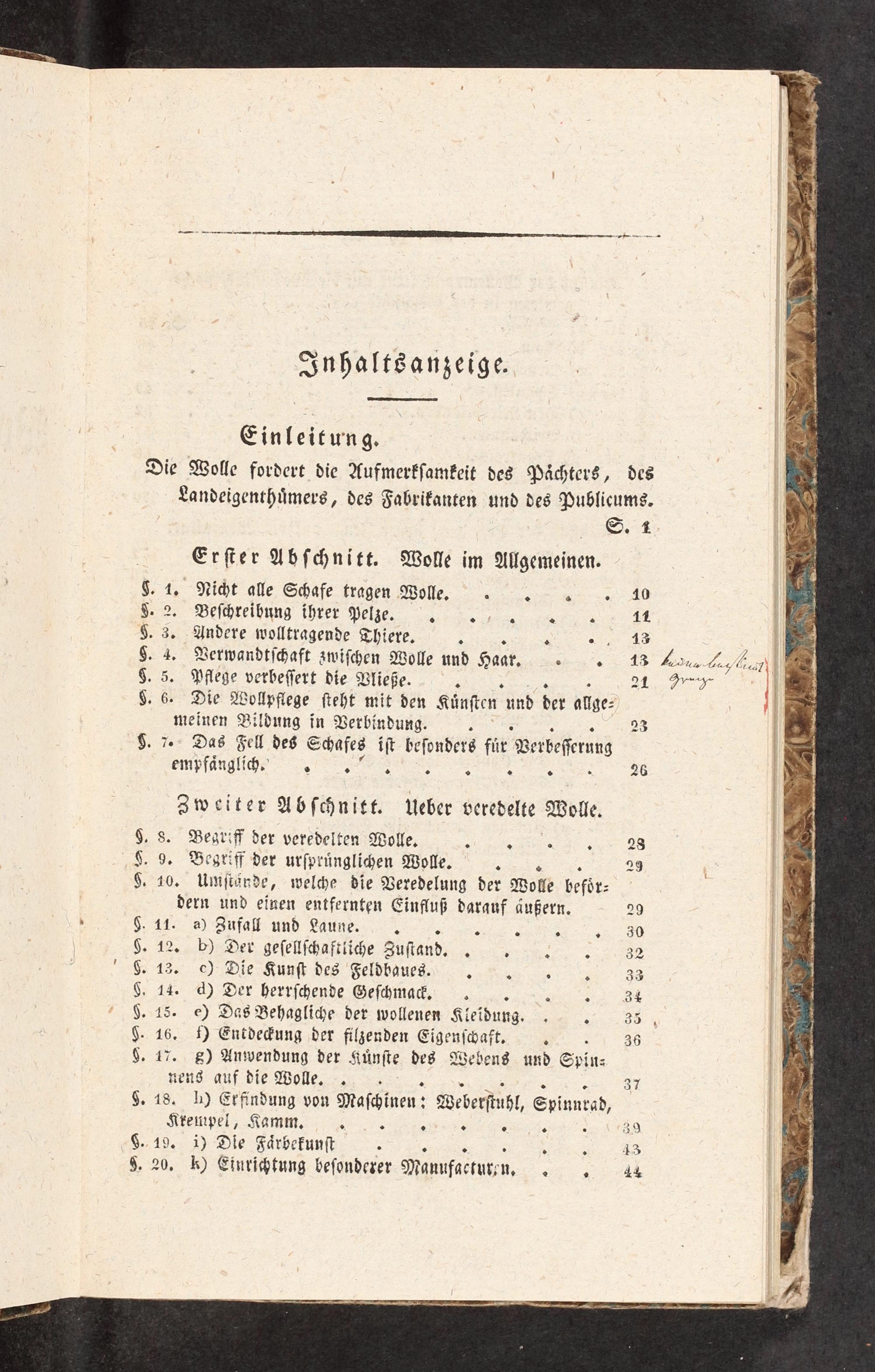 S. 1 Erſter Abſchnitt. Wolle im Allgemeinen. §. 1. Nicht alle Schafe tragen Wolle. 10 §. 2. Beſchrethung ihrer Pelze...„„. 11 §. 3. Andere wolltragende Thiere.... 13 §. 4. Verwandtſchaft zwiſchen Wolle und Haar..„. 13 §. 5. Pflege verbeſſert die Vließe.. 21 §. 6. Die Wollpflege ſteht mit den Künſten und der allge⸗ meinen Bildung in Verbindung.. 23 §. 7. Das Fell des Schafes iſt beſonders für werbeſerung empfaͤnglich.... 26 Zweiter Abſchnitt. Ueber veredelte Wolle. §. 8. Begriff der veredelten Wolle..... 228 §. 9. Begriff der urſpruͤnglichen Wolle.. 29 §. 10. Umſtaͤnde, welche die Veredelung der Wolle beför⸗ dern und einen entfernten Einfluß darauf äͤußern. 29 §. 11. a) Zufall und Laune.—.... 30 §. 12. b) Der geſellſchaftliche Zuſtand... 32 §. 13. c) Die Kunſt des Feldbaues..„.. 33 §. 14. d) Der herrſchende Geſchmack.. 34 §. 15. e) Das Behagliche der wollenen Kleidung... 35 §. 16. f) Entdeckung der filzenden Eigenſchaft.. 36 §. 47. 8) Anwendung der Kuͤnſte des Webens und Spin⸗ nens auf die Wolle.. 37 §. 18. h) Erfindung von Maſchinen: Weberſtuhl, Sriunie Krempel, Kamm....... 39 §. 19. i) Die Faͤrbekunſt.„ 132 §. 20. k) Einrichtung beſonderer Manufactur, n.„ 484