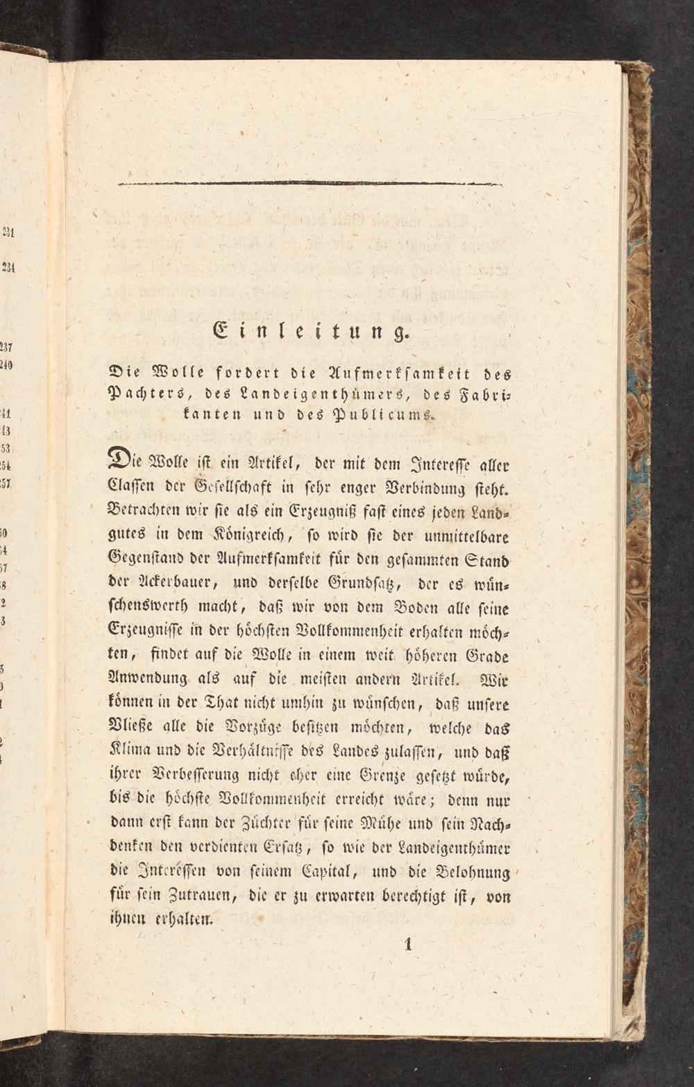 Die Wolle iſt ein Artikel, der mit dem Intereſſe aller Claſſen der Ge ſſellſchaft in ſehr enger Verbindung ſteht. Betrachten wir ſie als ein Erzeugniß faſt eines jeden Land⸗ gutes in dem Koͤnigreich, ſo wird ſie der unmittelbare Gegenſtand der Aufmerkſamkeit fuͤr den geſammten Stand der Ackerbauer, und derſelbe Grundſatz, der es wuͤn⸗ ſchenswerth macht, daß wir von dem Boden alle ſeine Erzeugniſſe in der hoͤchſten Vollkommenheit erhalten moͤch⸗ ten, findet auf die Wolle in einem weit hoͤheren Grade Anwendung als auf die meiſten andern Artikel. Wir koͤnnen in der That nicht umhin zu wuͤnſchen, daß unſere Vließe alle die Vorzuͤge beſitzen moͤchten, welche das Klima und die Verhaͤltniſſe des Landes zulaſſen, und daß ihrer Verbeſſerung nicht eher eine Grenze geſetzt wuͤrde, bis die hoͤchſte Vollkommenheit erreicht waͤre; denn nur dann erſt kann der Zuͤchter fuͤr ſeine Muͤhe und ſein Nach⸗ denken den verdienten Erſatz, ſo wie der Landeigenthuͤmer die Intereſſen von ſeinem Capital, und die Belohnung fuͤr ſein Zutrauen, die er zu erwarten berechtigt iſt, von ihnen erhalten.